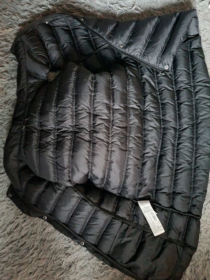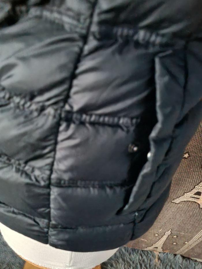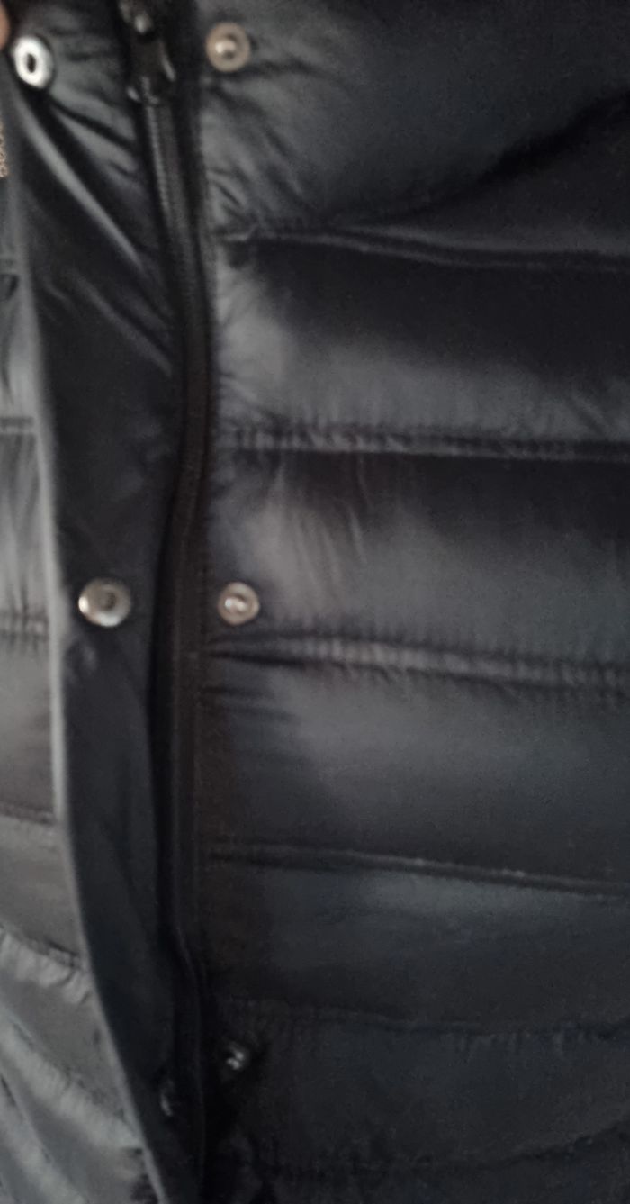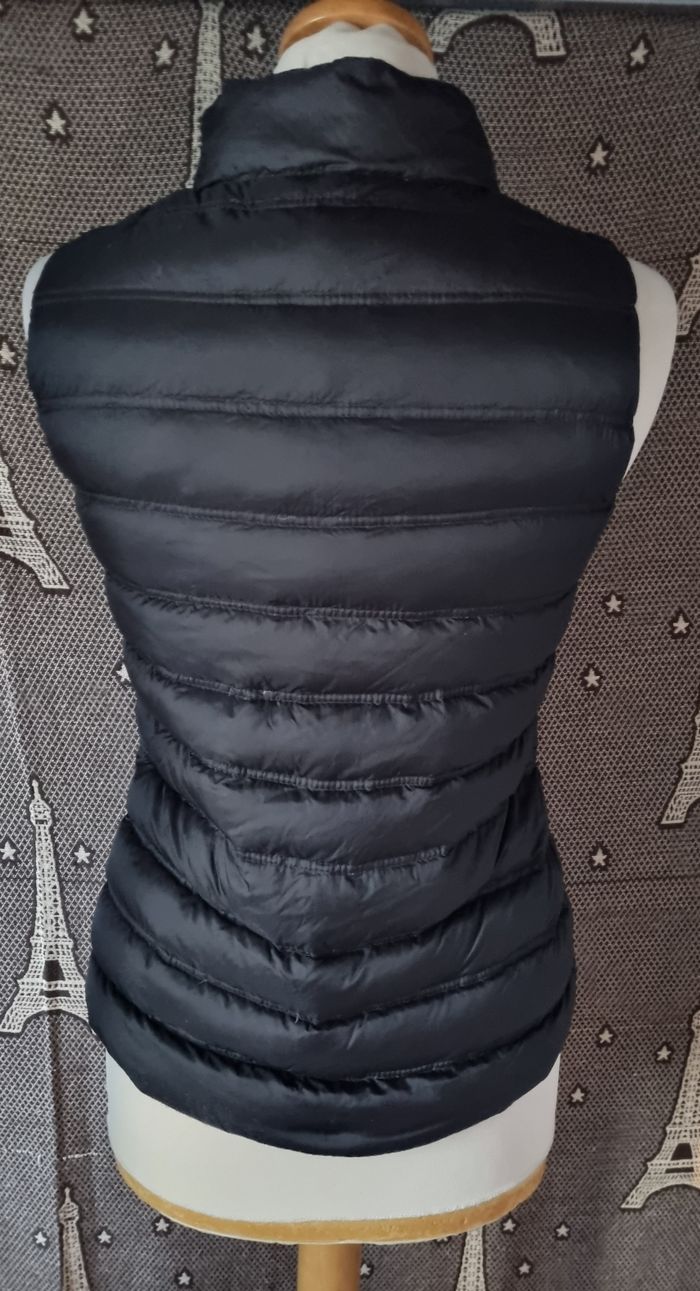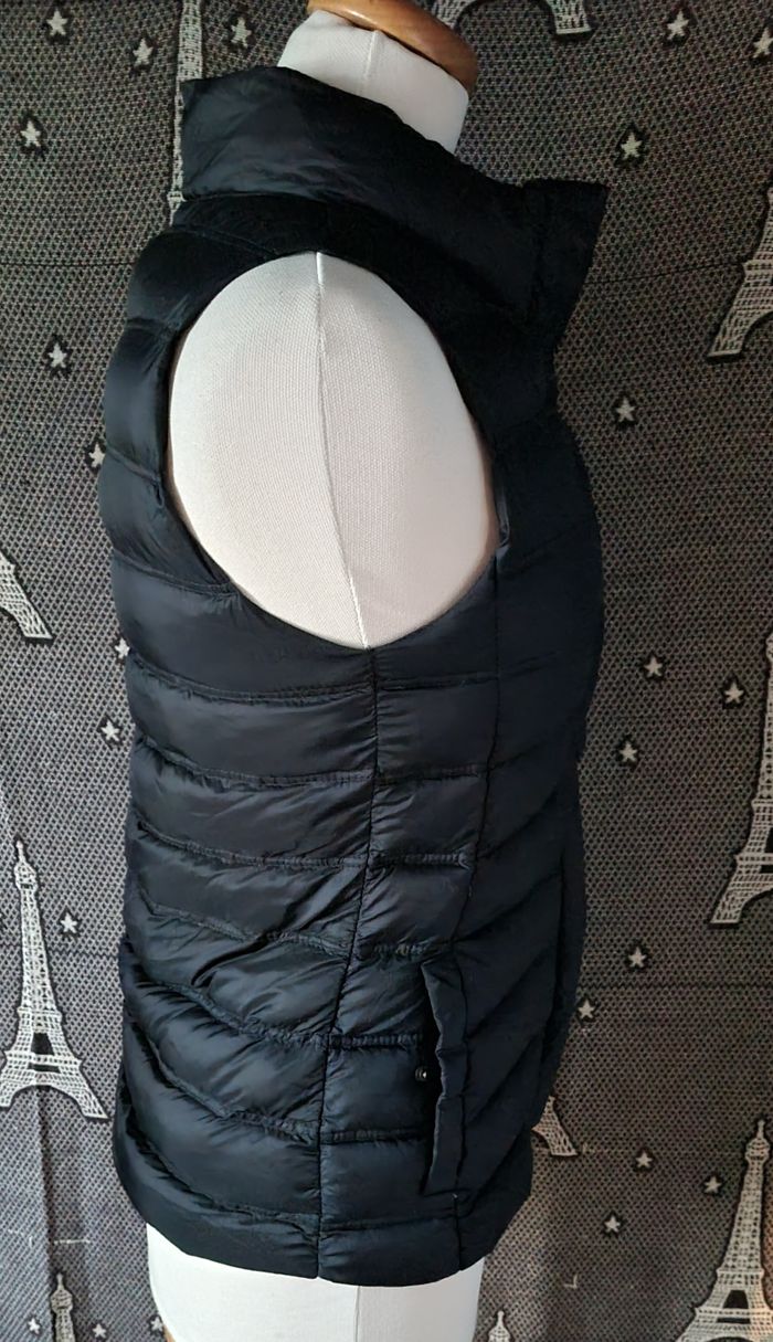 Veste doudoune zippée et pressions, sans manches noir,taille S marque Mango, 2 poches à pression,longueur 58cm, largeur 42cm, longueur épaule à aisselle 21cm, largeur aisselle à aisselle 44cm, largeur épaule à épaule 32cm,(rembourrage duvet de canard gris),légère et chaude.