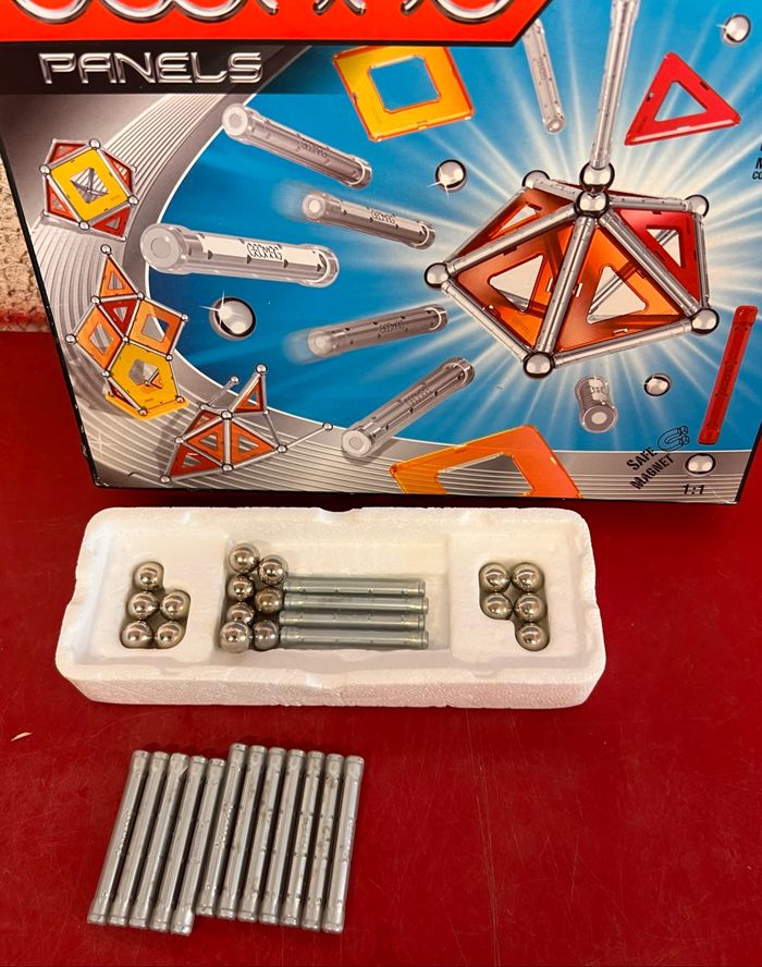 Geomag 44 pièces Geomag est un jeu de construction magnétique composé de barrettes aimantées et de sphères métalliques Grâce aux aimants placés à leurs deux extrémités, les barrettes se connectent aux sphères, vous permettant de construire de multiples figures géométriques