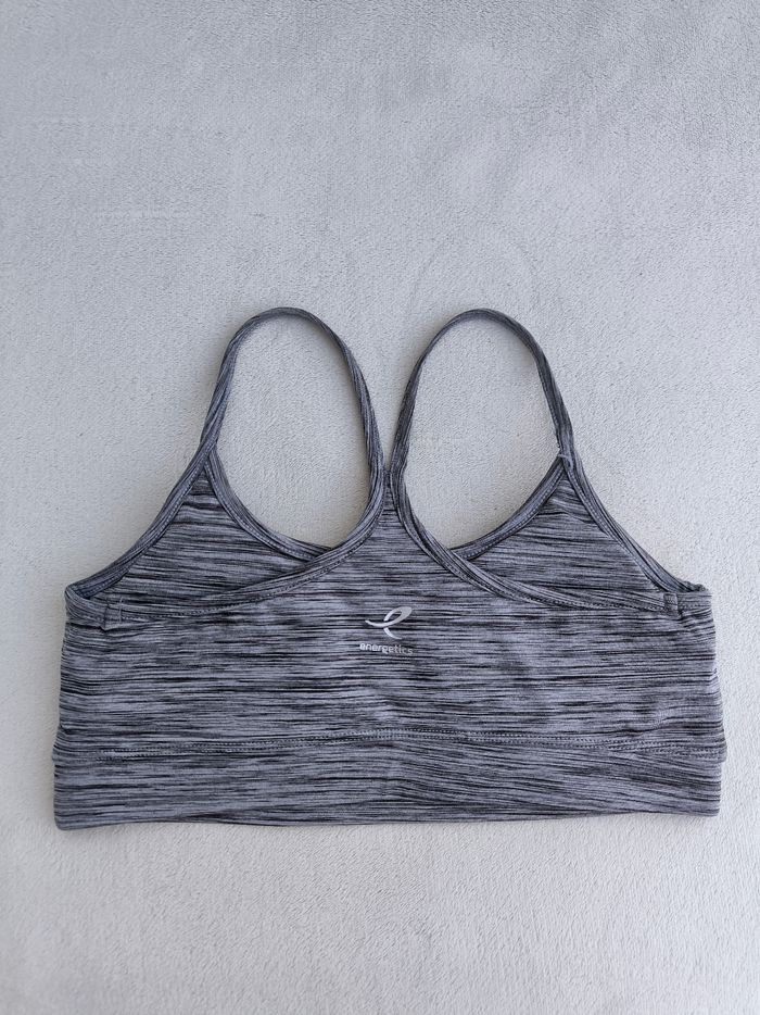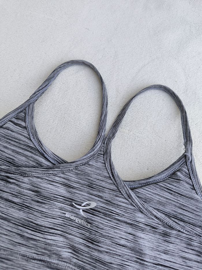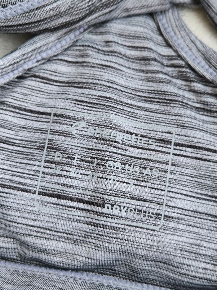 Haut / Brassière de sport à bretelles Marque Energetics Taille 40 • Coloris gris • Dry plus • Coques amovibles • Sans armature • Stretch • Côté d'une bretelle recousu Peu portée, en très bon état #evelyne_taille_40