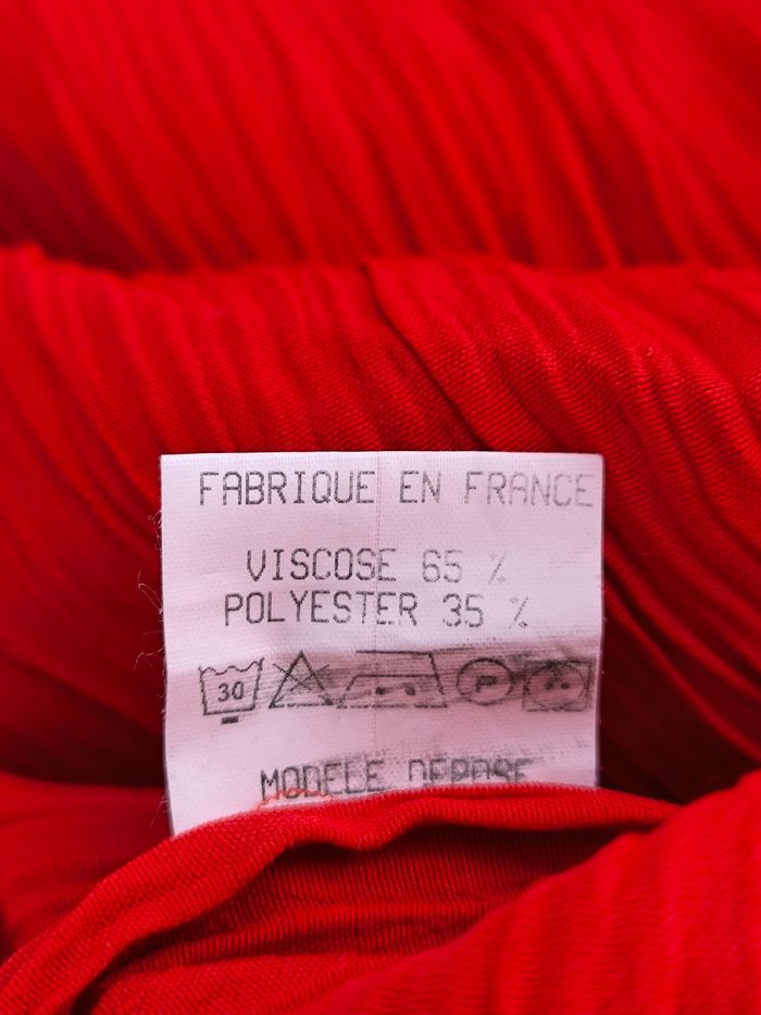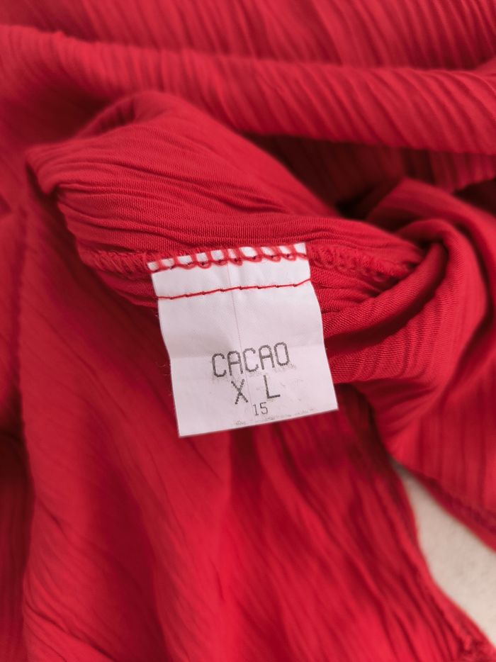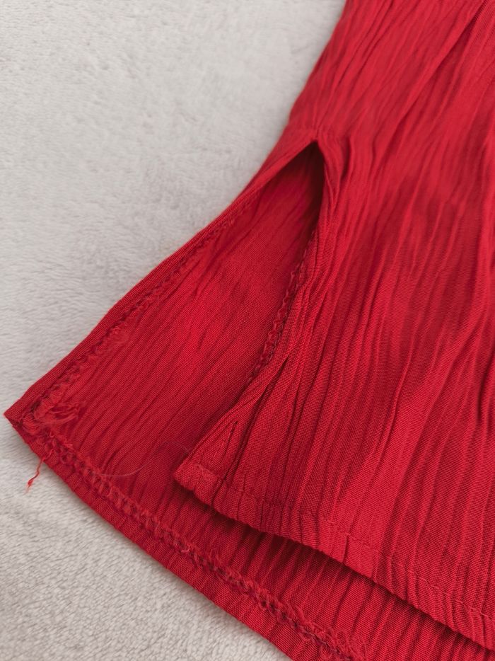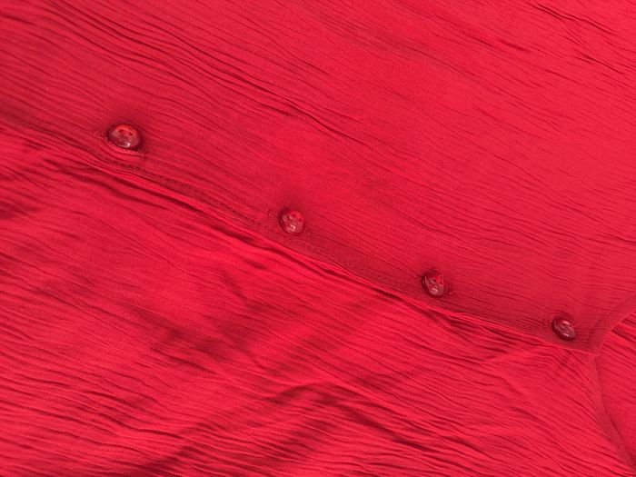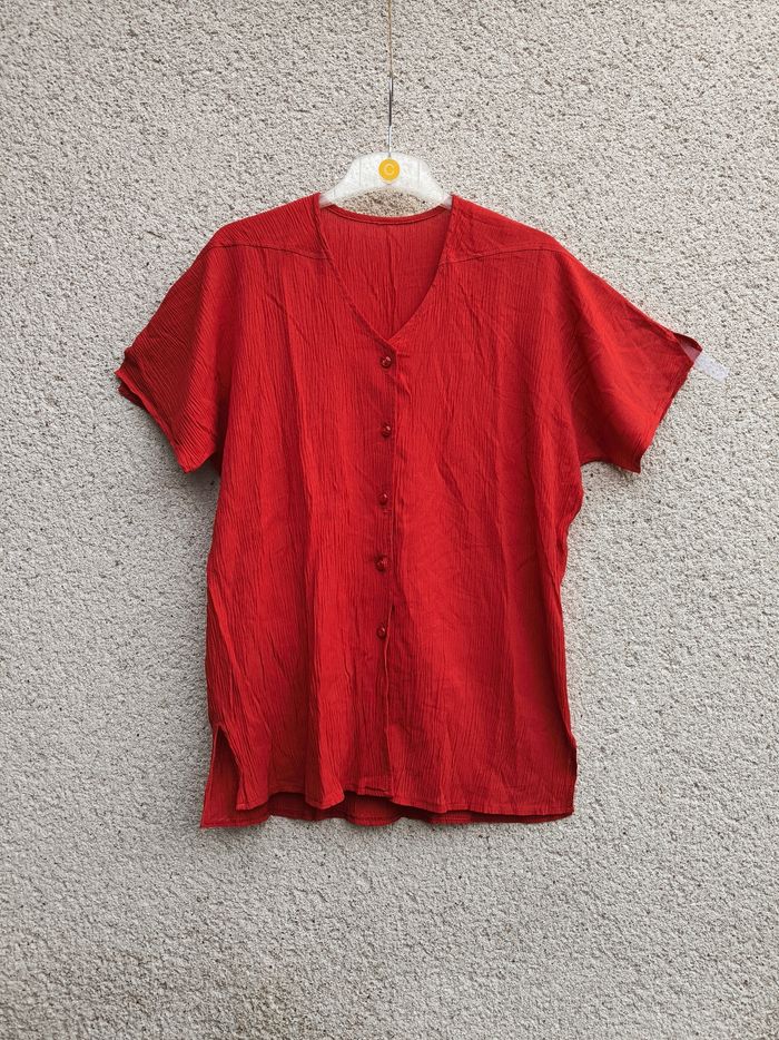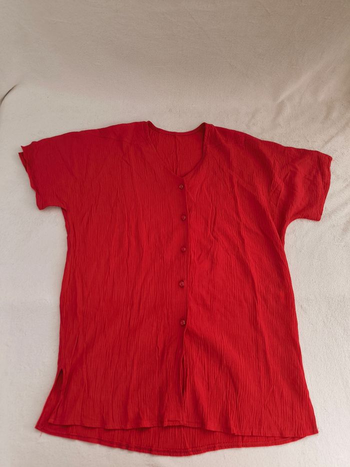 Chemise à manches courtes Taille XL, 42 • Coloris rouge • Effet plissé • Fermeture par boutons • Fendue sur les côtés • Tissu fin, stretch • Fabriquée en France Largeur aisselle à aisselle non étirée : 56 cm Largeur aisselle à aisselle étirée au maximum : 66 cm Longueur totale : 75 cm Longueur aisselle : 48 cm En très bon état #evelyne_taille_42