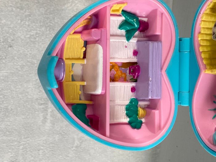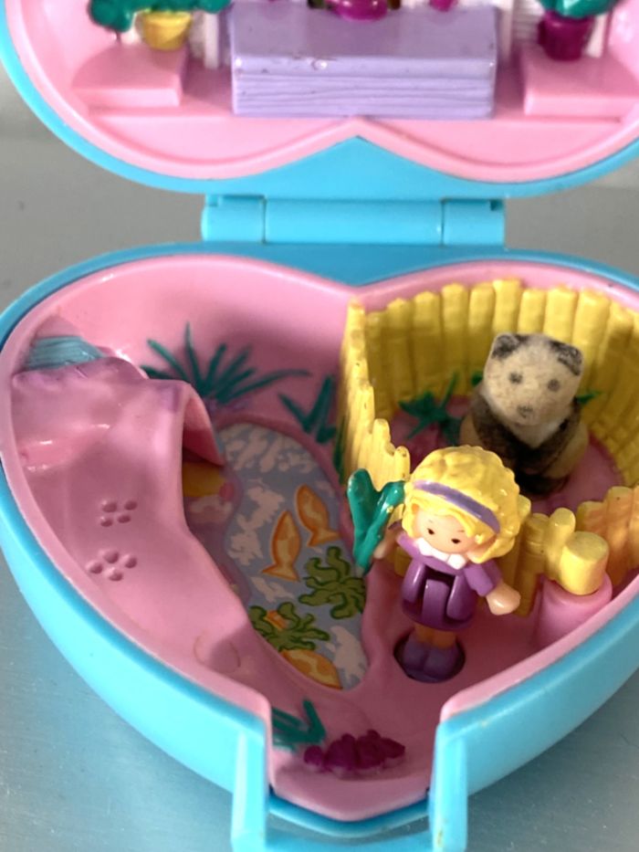 Polly pocket bluebird Pretty et ses pandas de 1993. Petite boîte forme coeur bleu turquoise. Décor asiatique partie supérieure. Enclos et grotte pour les pandas (le petit et manquant). La porte de l'enclos s'ouvre. 1 Polly et un panda au toucher doux. Le tout est en très bon état, pas de casse.