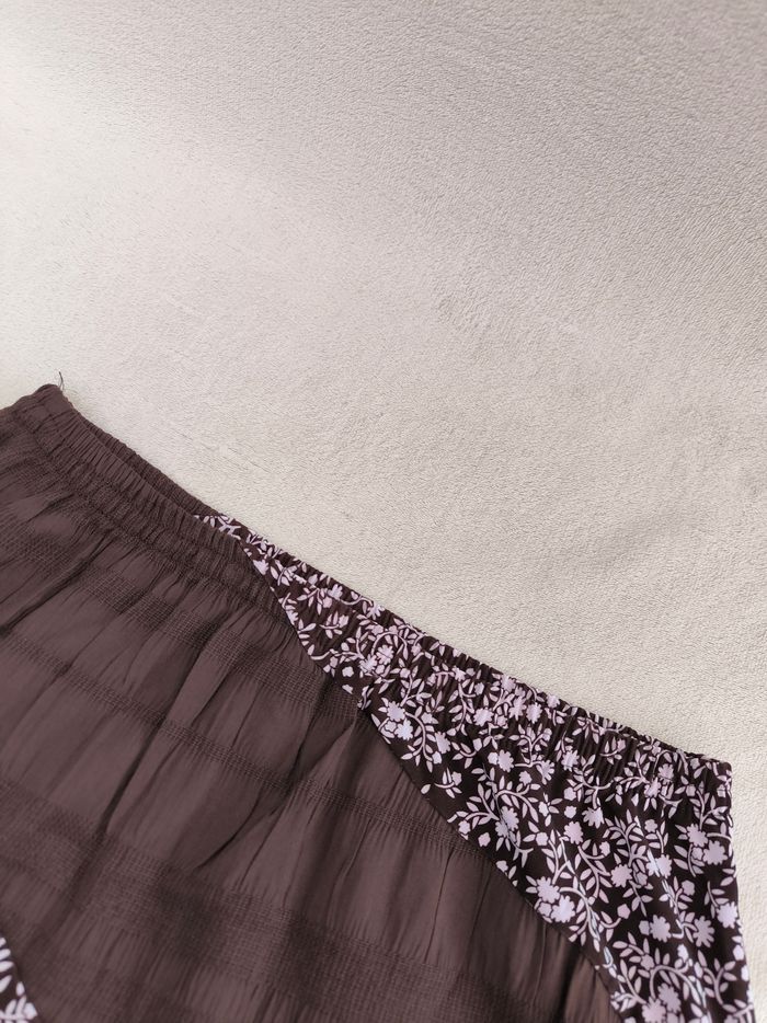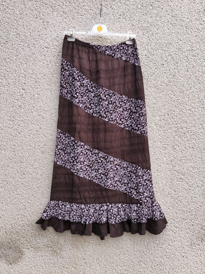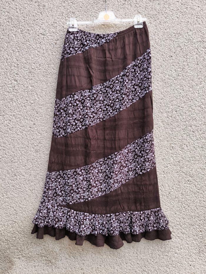 Jupe longue Taille 3, 40-42, taille grand • Coloris marron, blanc • Imprimés fleurs • Taille élastique • Volantée sur le ba, effet plissé • Tissu fin, fluide Largeur taille non étirée : 34 cm Largeur taille étirée au maximum : 55 cm Longueur totale : 95 cm Style bohème En très bon état #evelyne_taille_40 #evelyne_taille_42