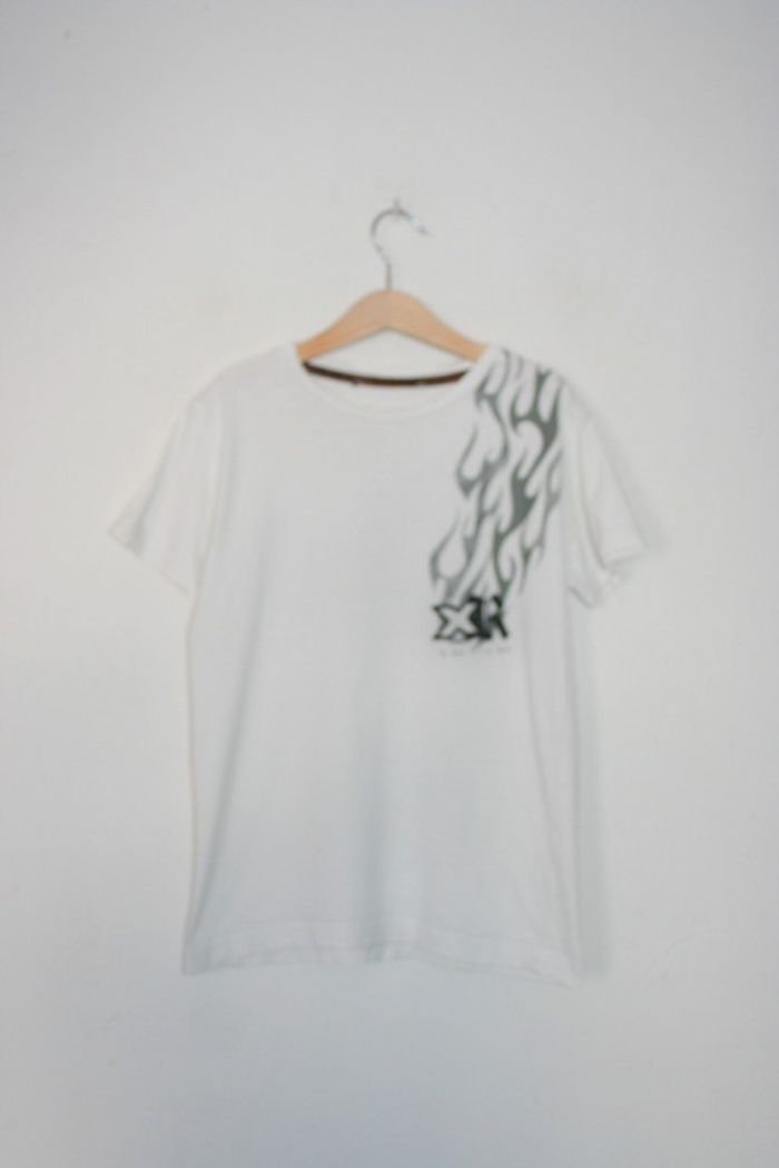 Tee-shirt blanc manches courtes, sans étiquette de taille, à vérifier masi doit correspondre environ à un 10 ans, 31cm d'épaule à épaule, 38cm d'aisselle à aisselle, 50cm de long, 100g
