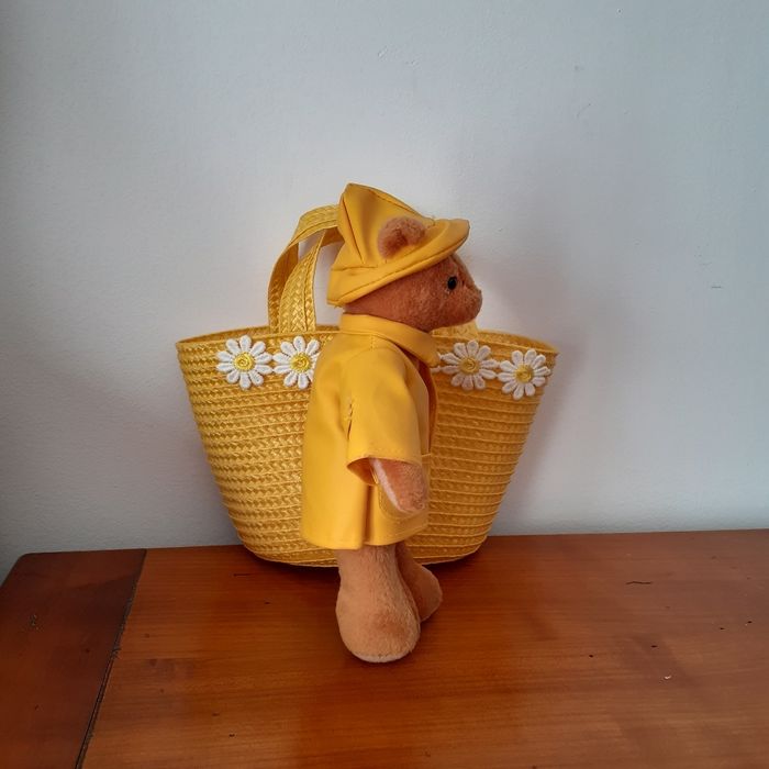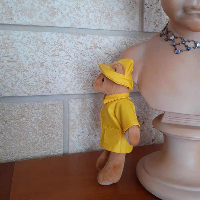 Doudou-peluche avec imperméable et chapeau de pluie non amovibles. Yeux boutons et museau en tissu. Hauteur totale de 17,5 cm. Ne tient pas debout // voir photos pour détails