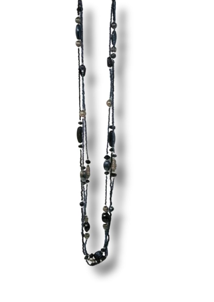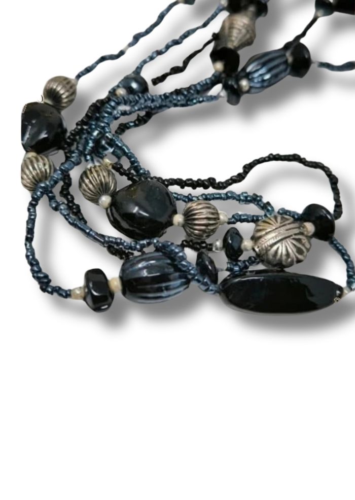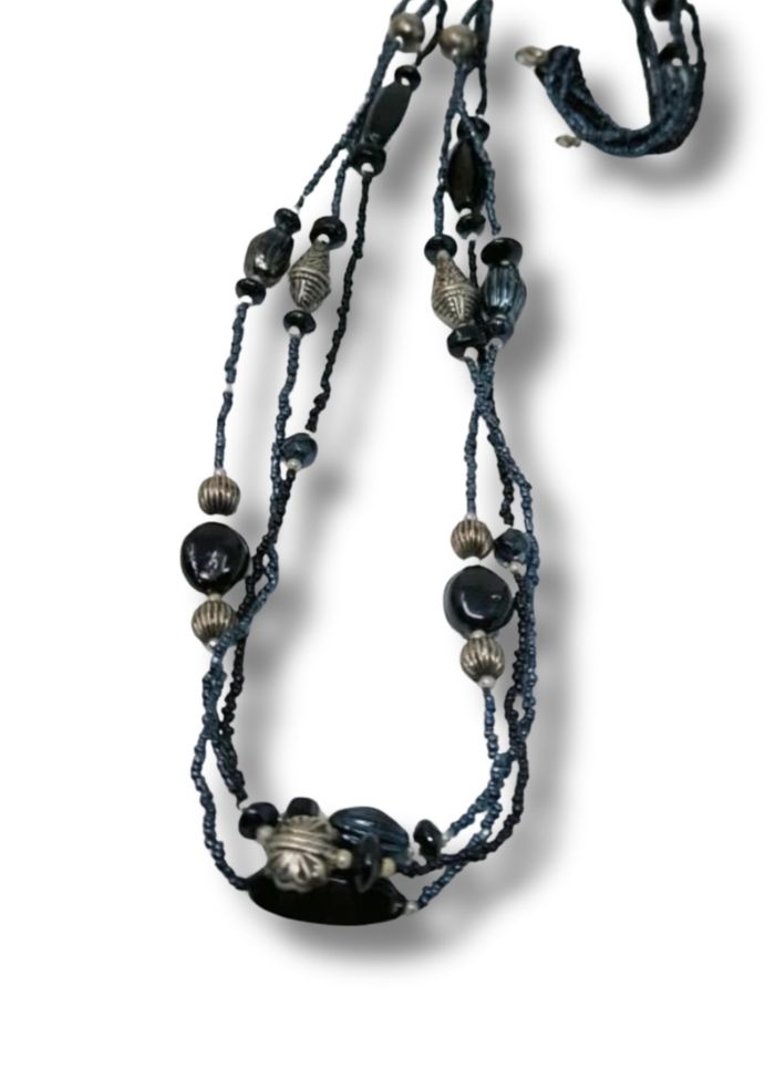 ✨ Magnifique sautoir Vintage ✨ 3 rangs avec fermoir argenté Composé de perles en verre noires et bleu nuit Longueur : env. 110 cm (soit 55 cm porté fermé) Bijou rétro chic, en parfait état Un collier unique qui apportera une touche élégante et sophistiquée à vos tenues 💎