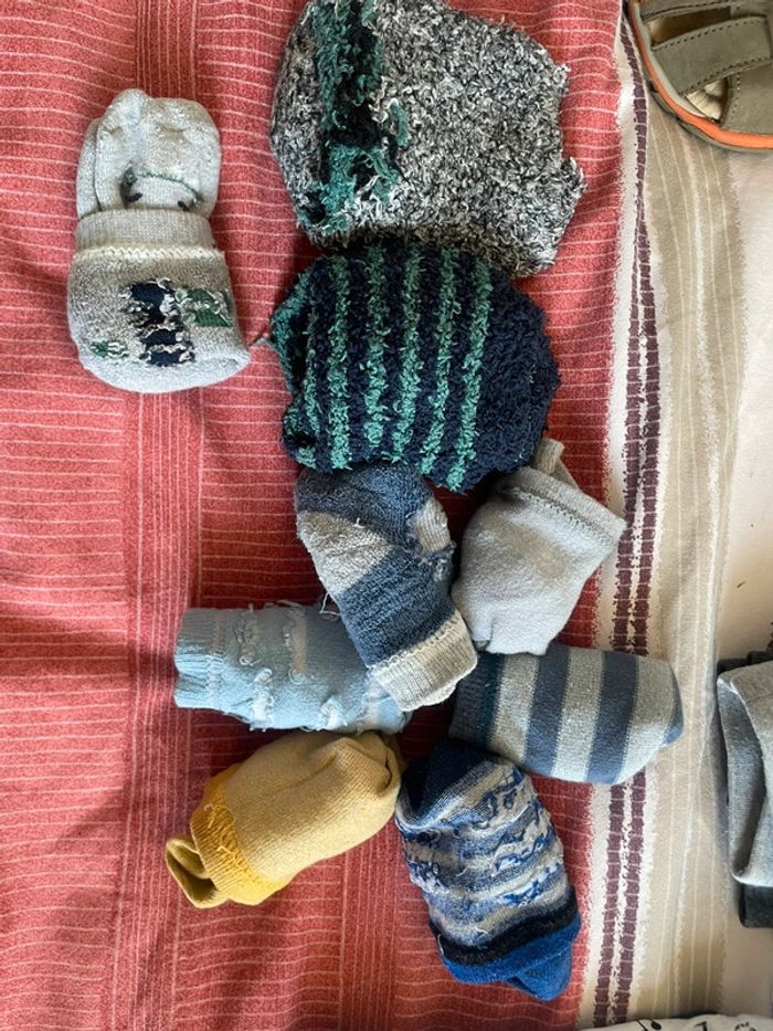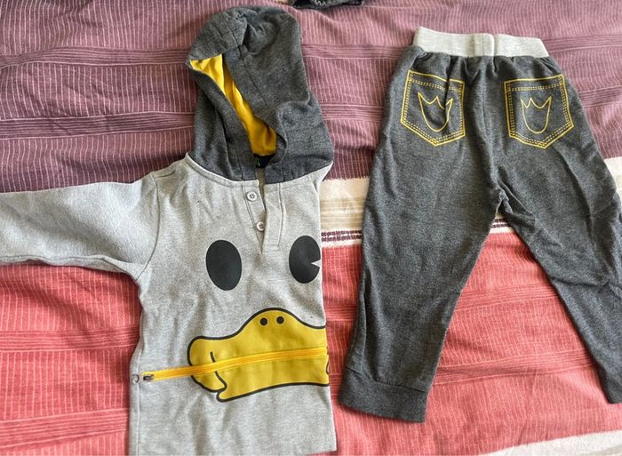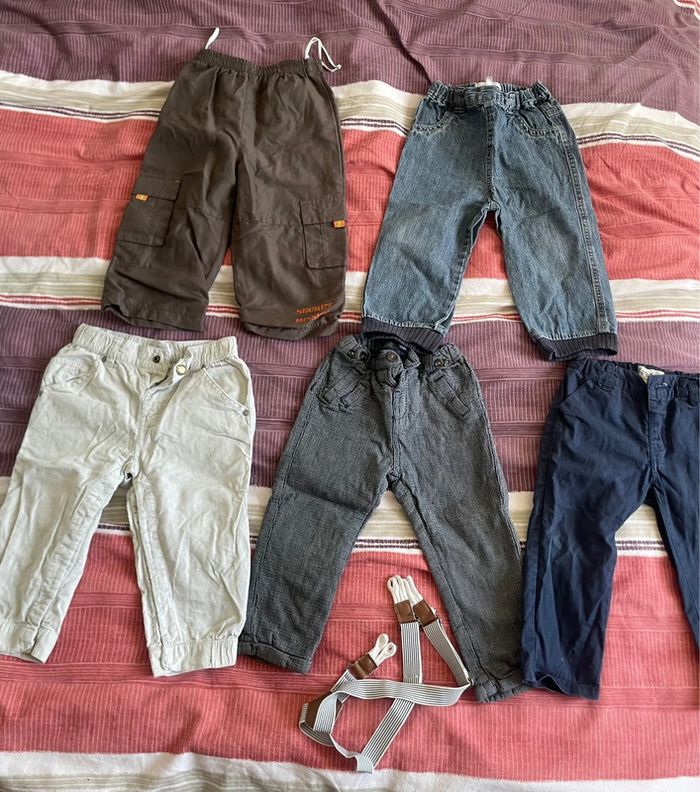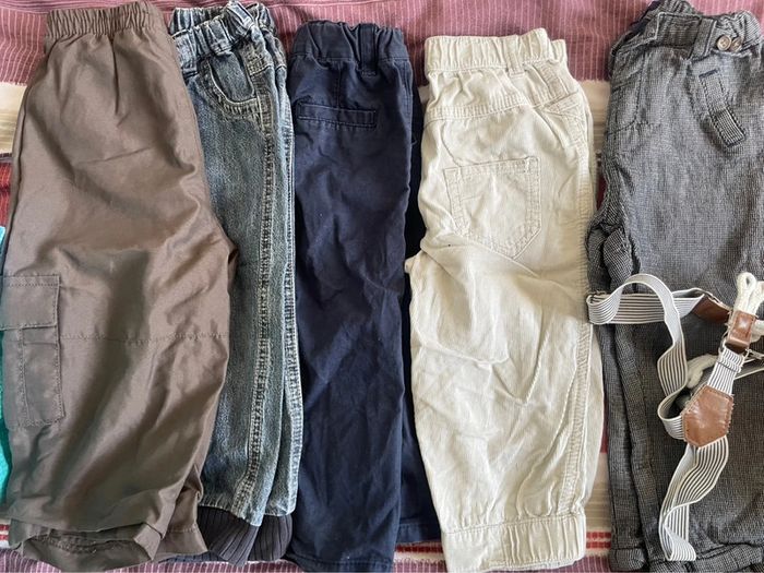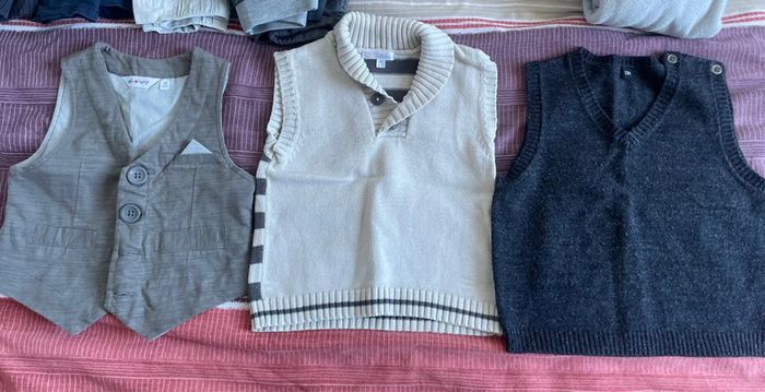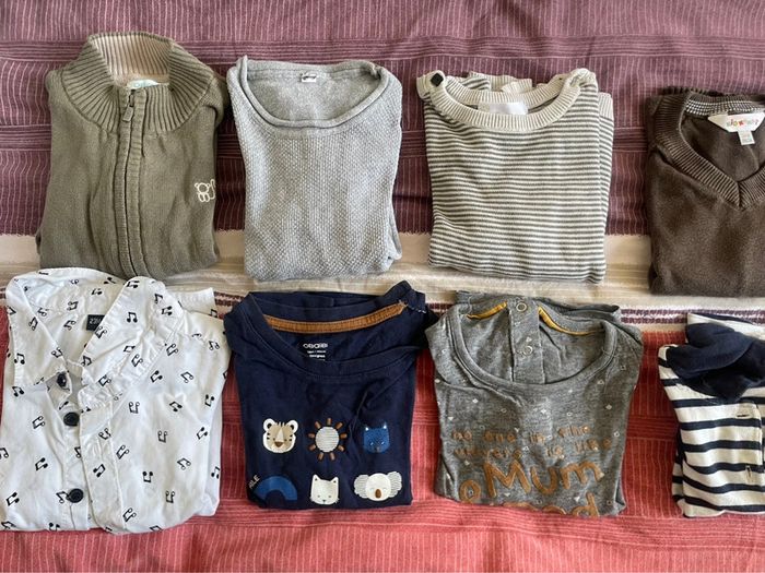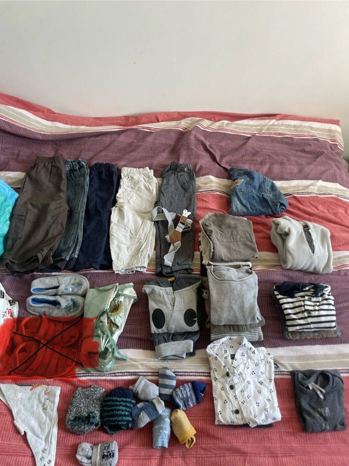 -3 paires chaussons chaussettes -6 paires de chaussettes -1 paire de chaussons -1 body manches longues -2 chemises bavoirs + 1 bavoir bandana -1 veste jean -3 hauts M.Longues + 1 chemise -3 pulls sans manches -4 pulls fins -1 ensemble jogging poussin -5 pantalons Tout sera relavé pour la vente . Pas de défaut caché : si abîmé , précisé et donné pour dépanner . D’autres lots similaires sur mon dressing ; n’hésitez pas à regarder et à me contacter , petits prix à la clé à bientôt ☀️