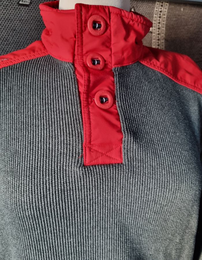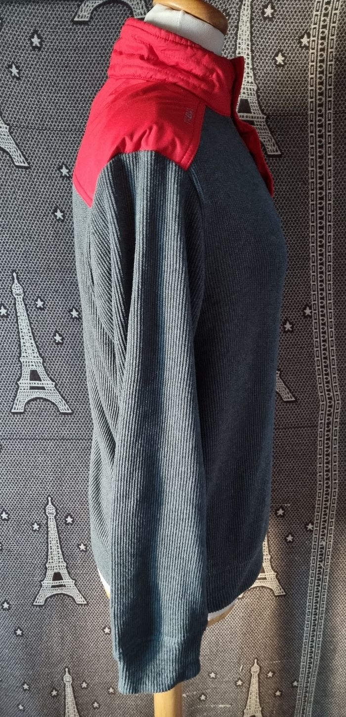 Pull côtelé gris et rouge ,taille M marque Tribord, (la partie rouge est style imperméable),col boutonnée ,longueur 65cm, largeur 48cm, longueur épaule à aisselle 22cm, largeur aisselle à aisselle 52cm, longueur manche 52cm,très chaud peu porté.