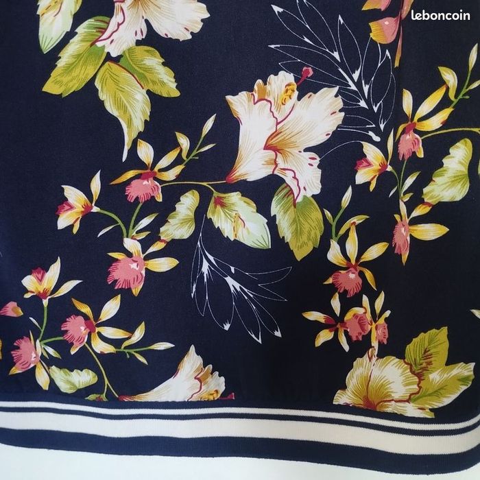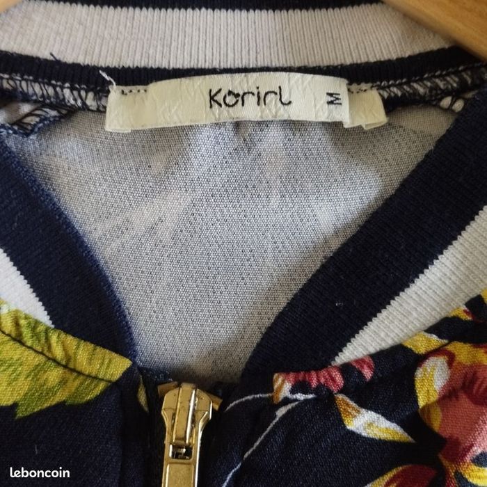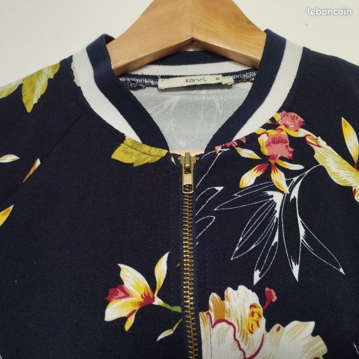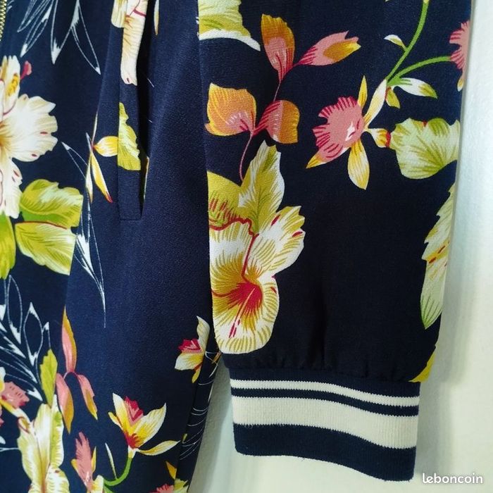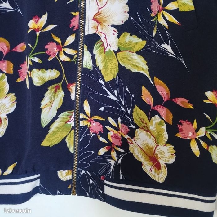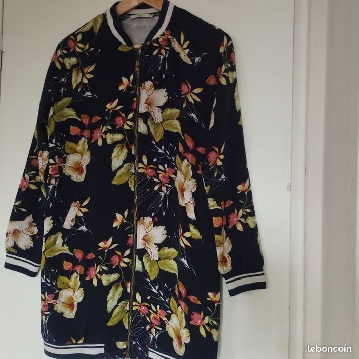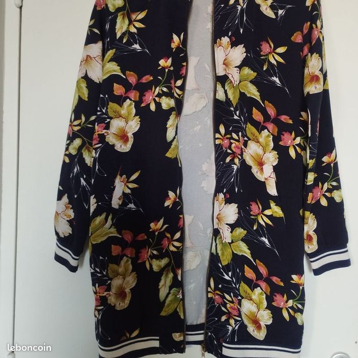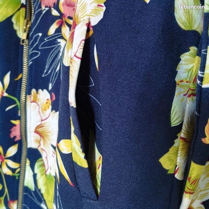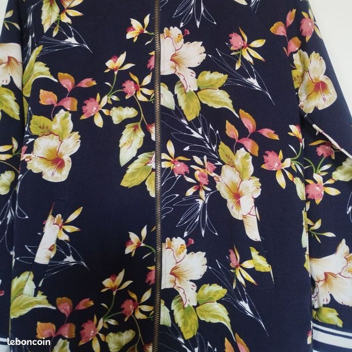 Veste longue et peut se remonter jusqu'à la taille pour faire blouson ! Le bas de la veste ainsi que le bas des manches sont en matière coton élastiquées. 2 poches en biais sur les côtés, se ferme par fermeture éclair métallique. Couleur bleu marine et motifs vert, anis, blanc, rose, bordeaux !