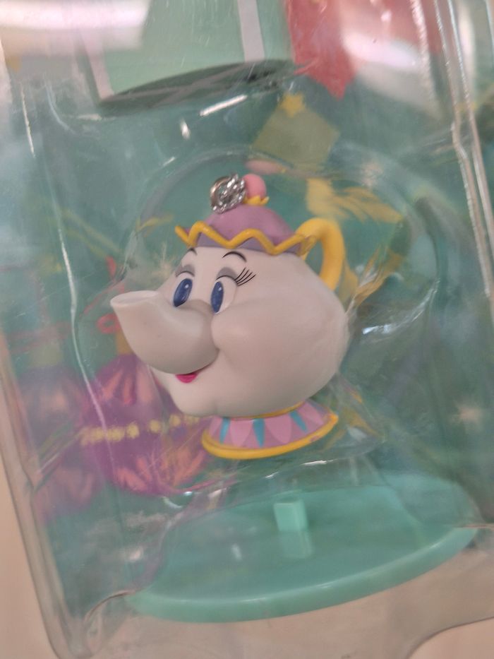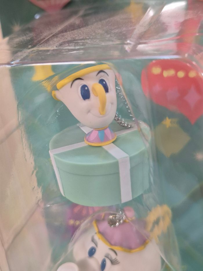 Figurine/ ornement de Noël Disney Happykuji 2020 : Zip & Samovar (La Belle et la Bête). Plastique, environ 3-4 cm, en excellent état sous blister en état correct. Chaque figurine vient avec un lien pour accrocher dans le sapin et un socle pour exposition.