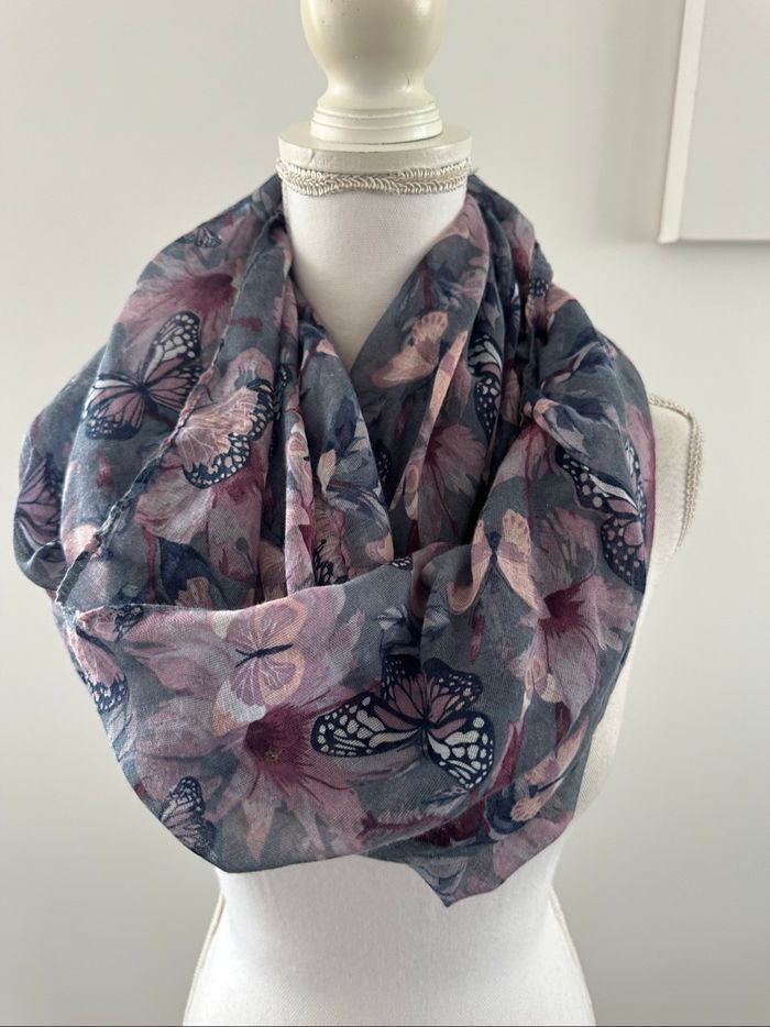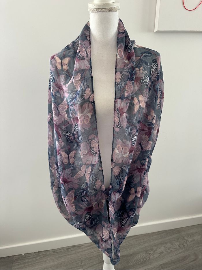Foulard snood - Excellent état - Imprimés papillons - Rose, violet, bleu - Pas d’étiquette de matière - 90x85cm