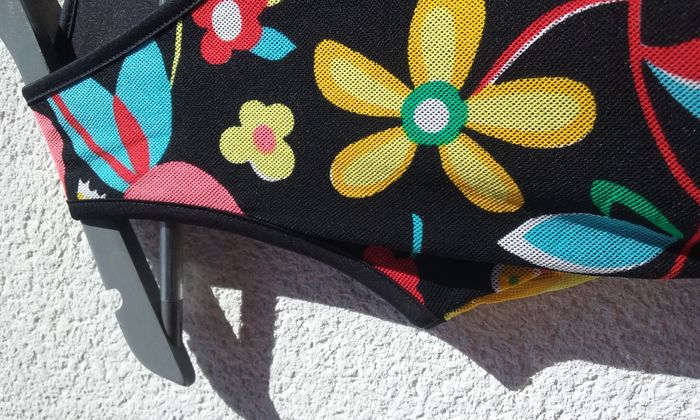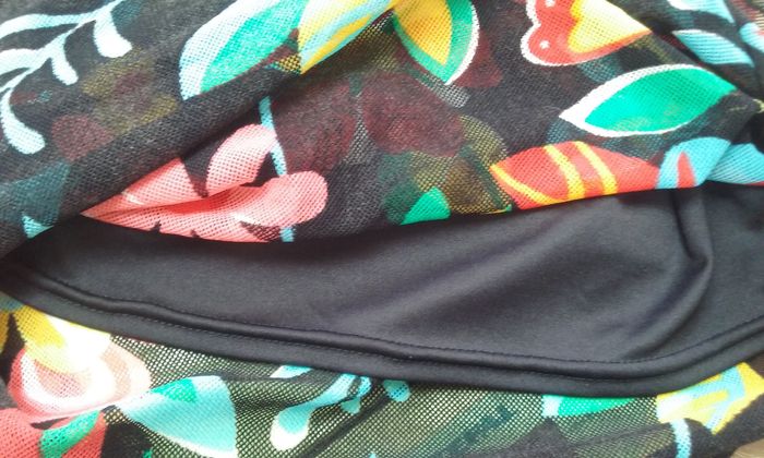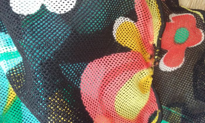 Très jolie tunique aux influences psychédéliques, le haut est doublé, le bas est transparent. En très bon état, si ce n'est un petit accroc à peine visible au niveau de la couture au bas du dos qui a été reprisé (cf dernière photo)!