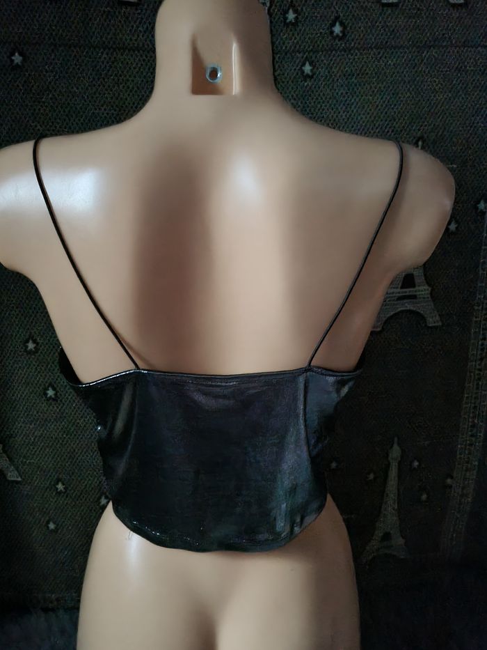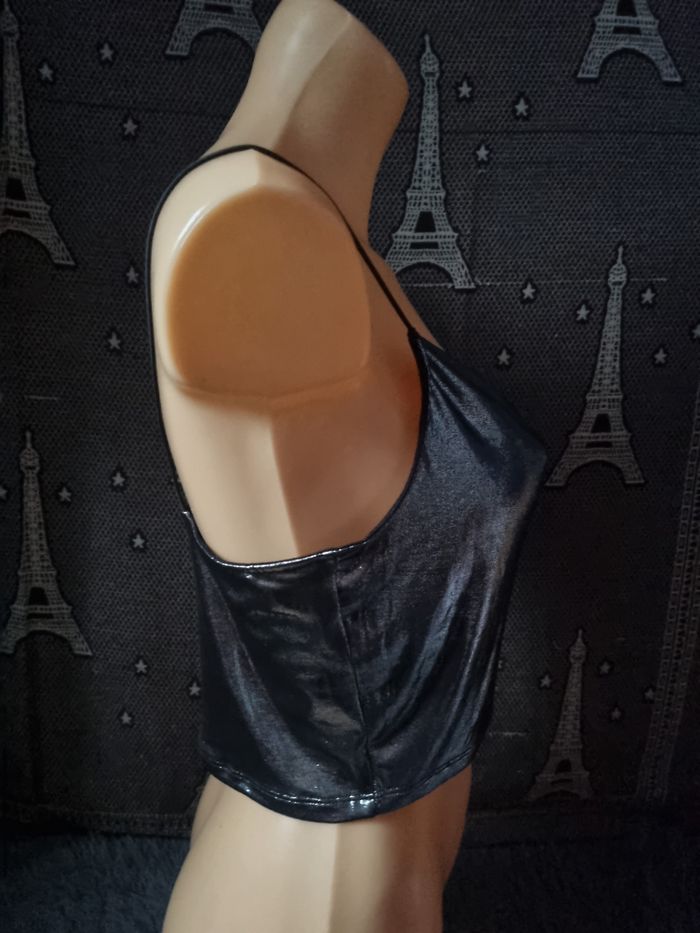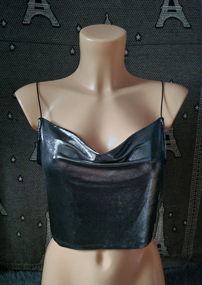 Top court argenté à bretelles élastique, taille S marque H&M Divided, longueur 28cm (sans les bretelles),largeur 39cm, largeur aisselle à aisselle 42cm.