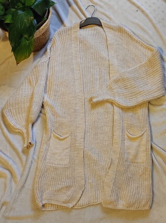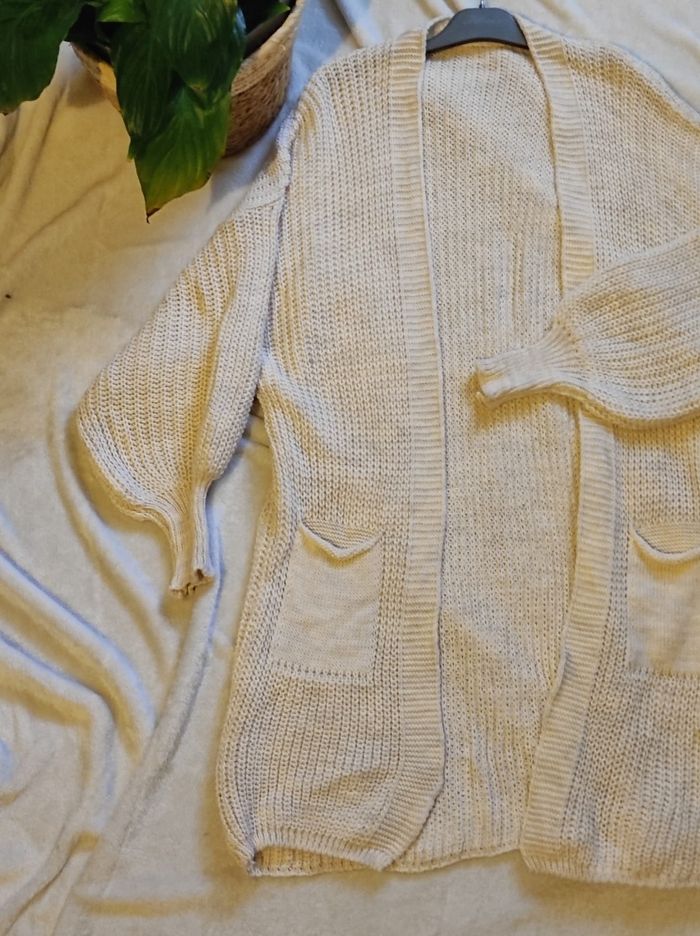 gilet oversize avec deux poches et manches longues à ballons, de couleur beige claire / crème. En taille unique. Façon tricot. 100% acrylique. En parfait état.