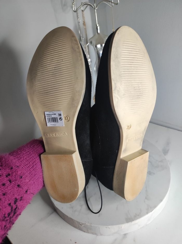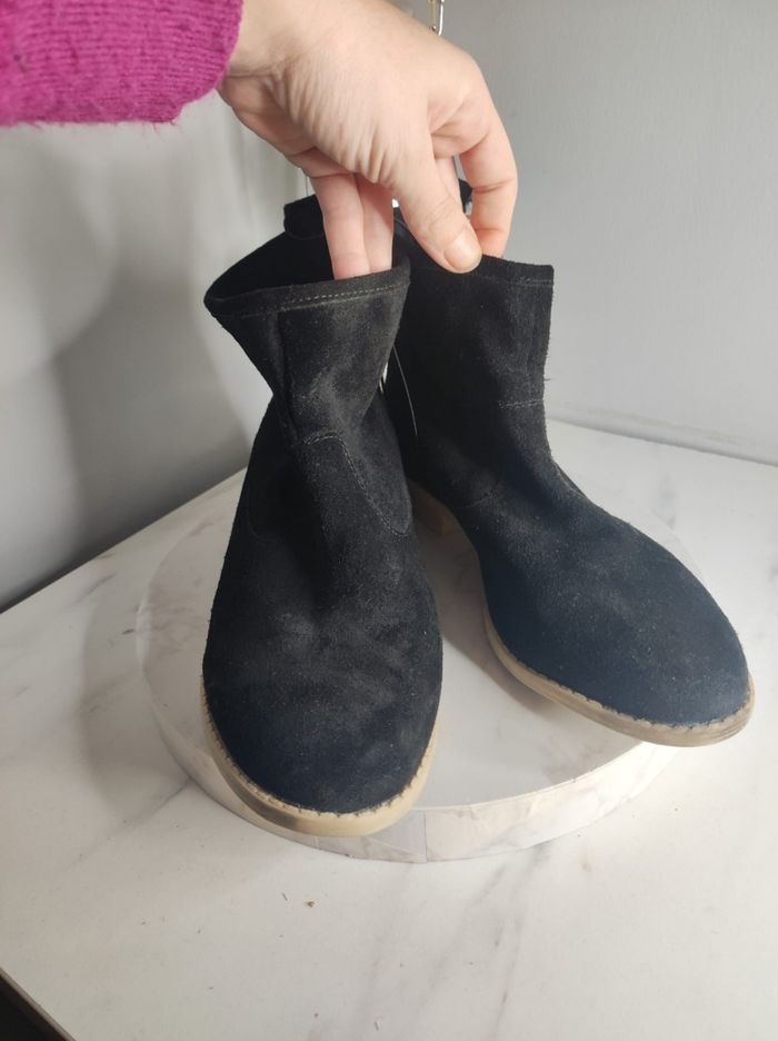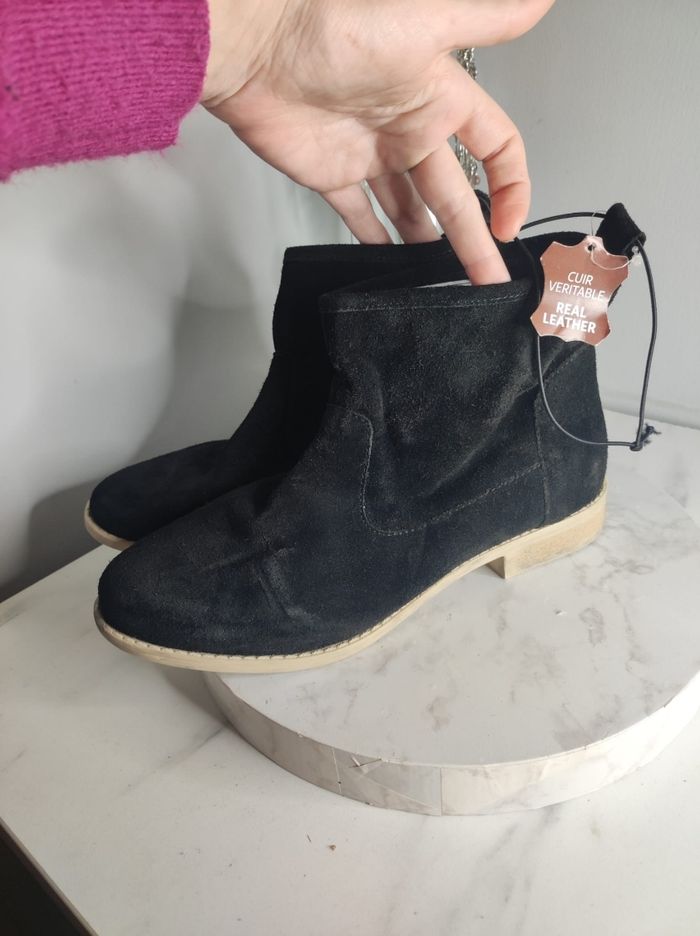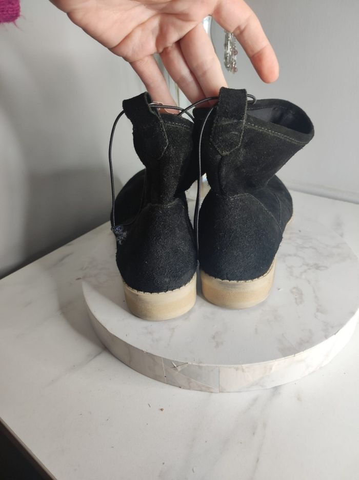 Petites paires de bottines façon daim et cuir, jamais porter cependant peut avoir des traces de frottements ( car rester stocké en boîte avec d'autres chaussures) cela peut peut-être partir avec un petit nettoyage.