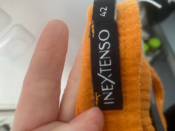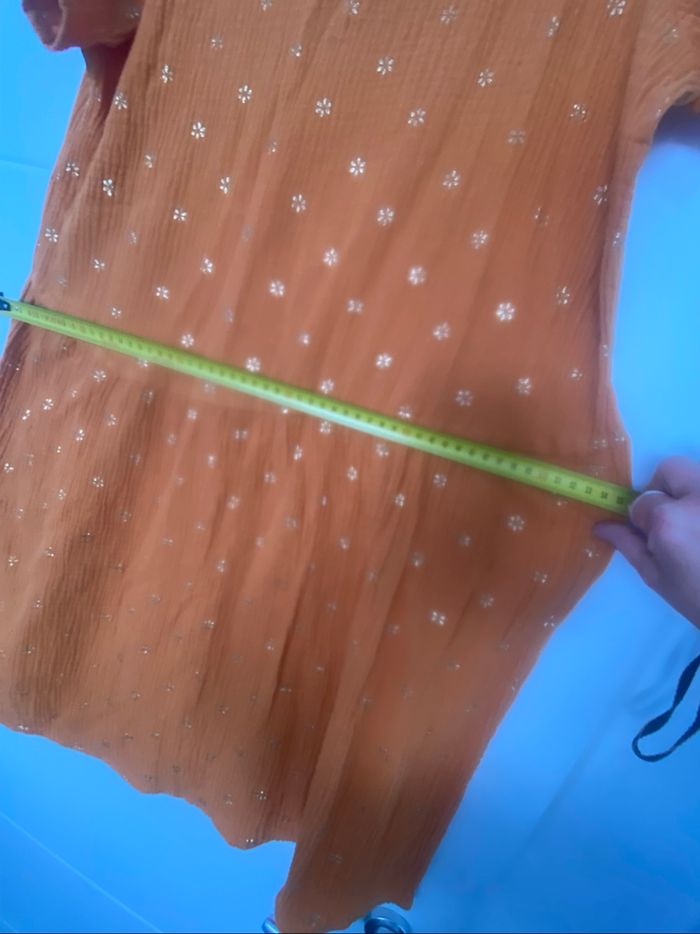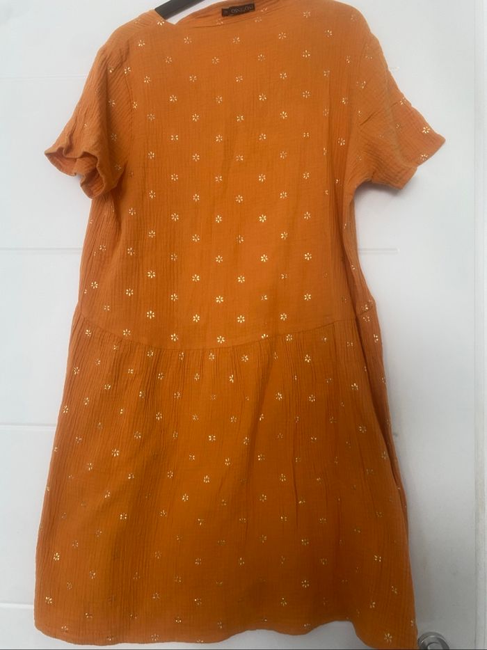 Robe orange et dorée , taille 42 en très bon état. 5€