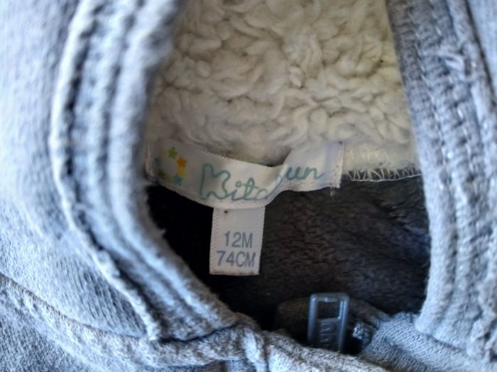Gilet a capuche gris de la marque Kitchoun, taille 12 mois / 74 cm. L'intérieur de la capuche est doublé en polaire. Fermeture éclair + boutons pression Très bon état