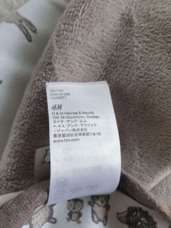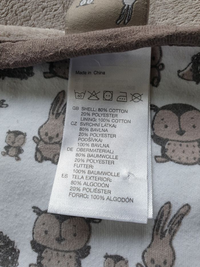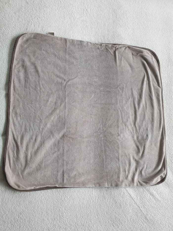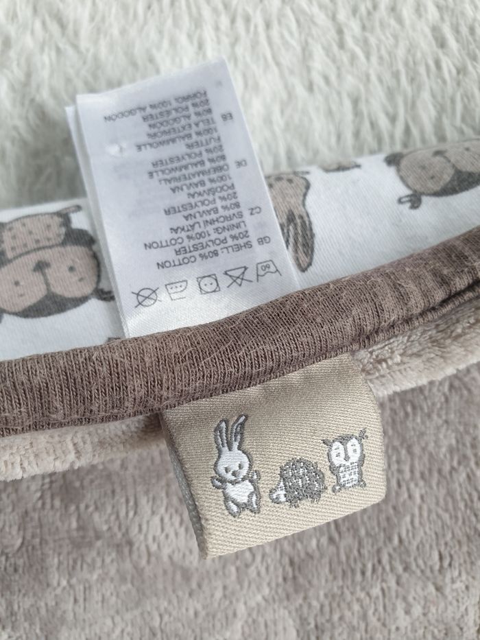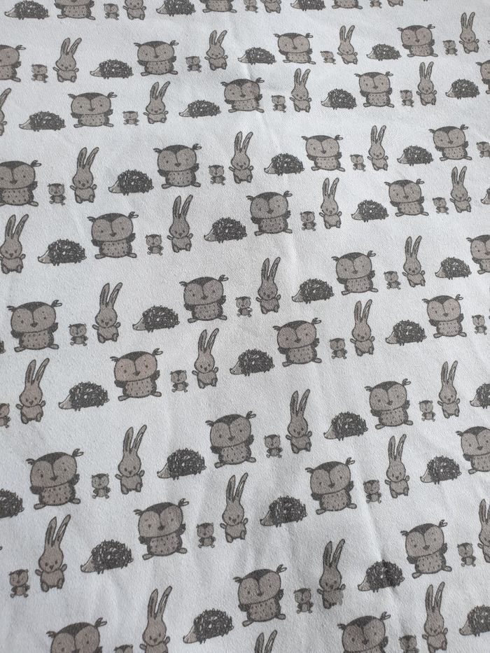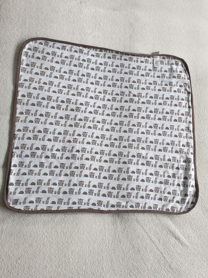 Plaid bébé côté gris et côté blanc avec décor animaux. Il mesure environ 77cm x 83cm.