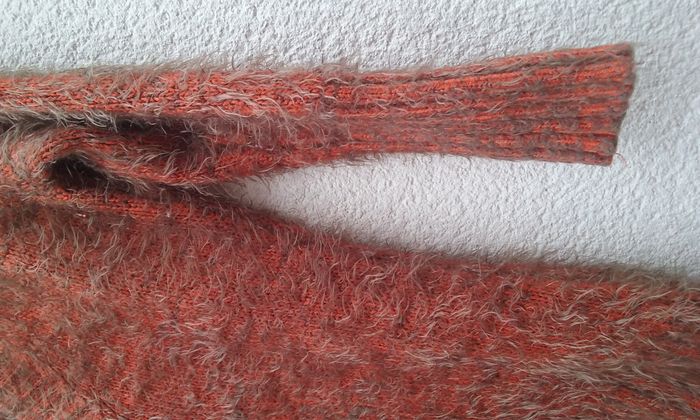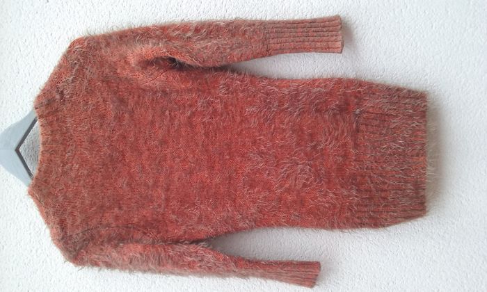 Pull long tout doux, tout chaud, coloris orange-rouille, 20% laine-70% acrylique-10% élasthanne, T36/38.