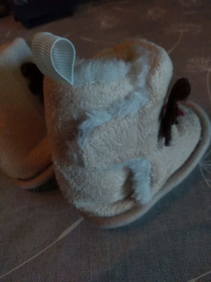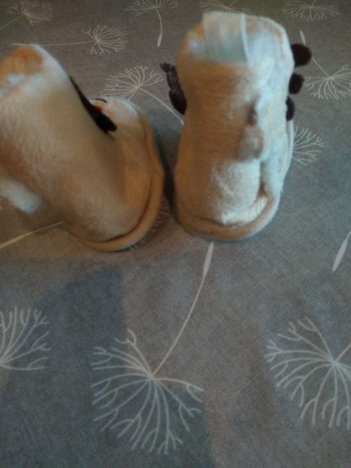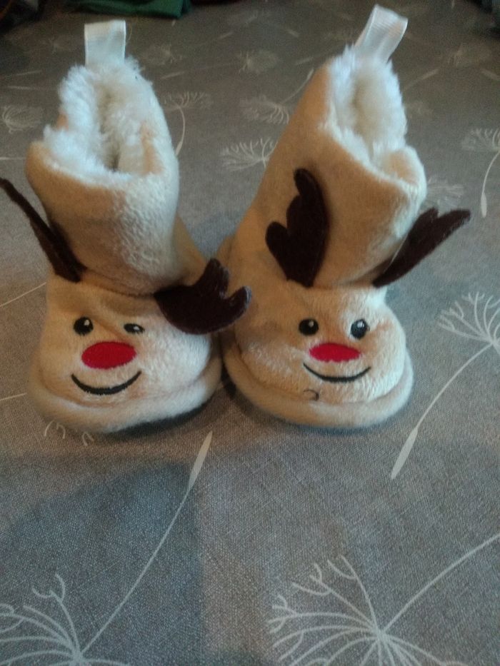 Chaussons fourrés, semelles antidérapantes. Pas de pointure mais correspond à un 17. Etat impeccable.