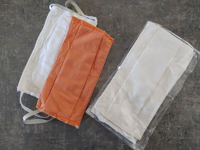 Lot 2 masques crème pour adulte en coton 2 autres masques en très bon état, un blanc et un orange Possibilité de remise en main propre sur REMIREMONT ou envoi #accessoirehommenaldocel88 #accessoirefemmenaldocel88