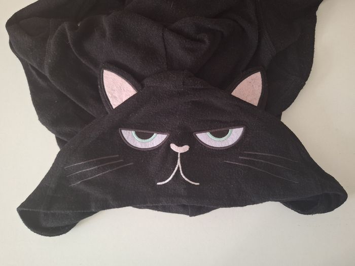 Déguisement chat, boutonné devant avec tête de chat pour la capuche. Brodé poitrine côté gauche. En tissu sorte polaire doux, quelques bouloches.