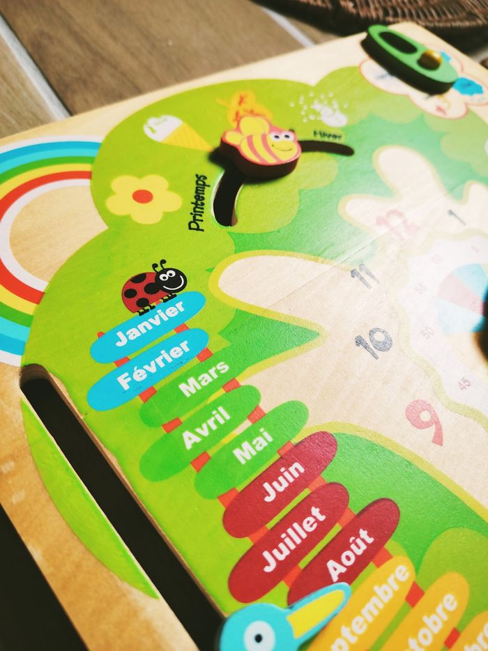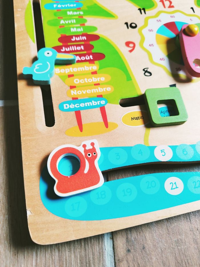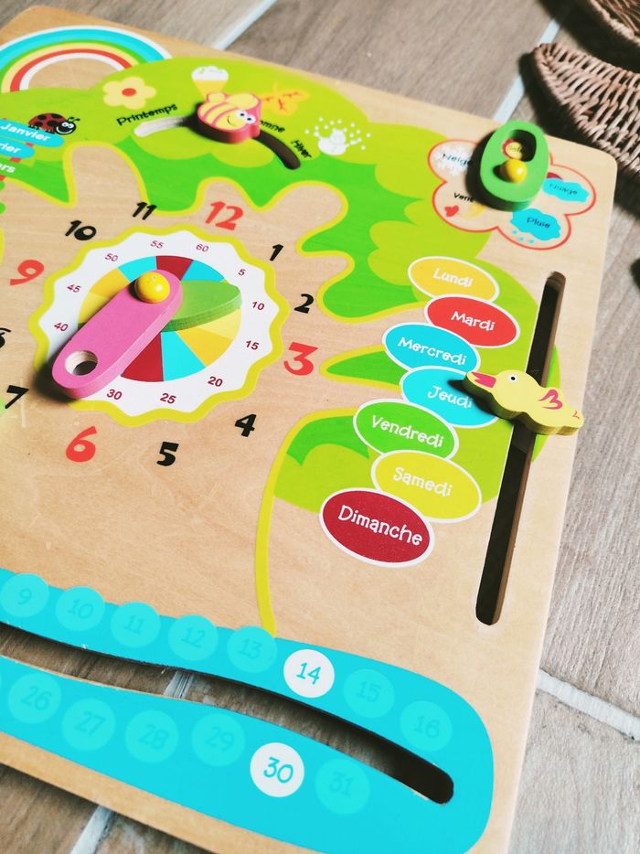 🌞Planche /panneau d'éveil multi activités calendrier perpetuel Météo et temps en bois marque Biloba JB1785