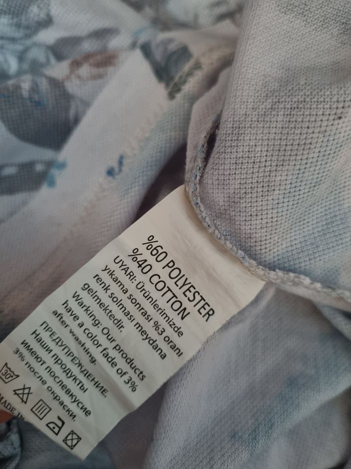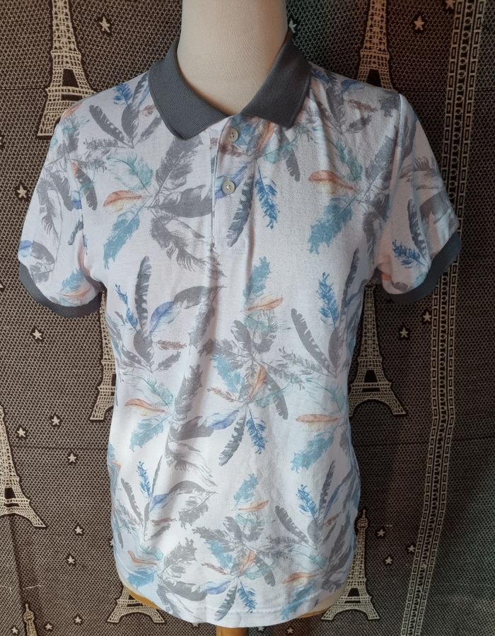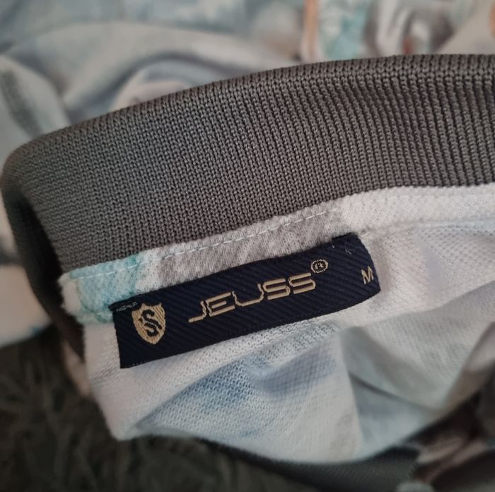 Polo blanc à motifs feuilles de palmiers, taille M marque Jeuss ,longueur 62cm ,largeur 45cm, longueur épaule à aisselle 20cm, largeur aisselle à aisselle 48cm.
