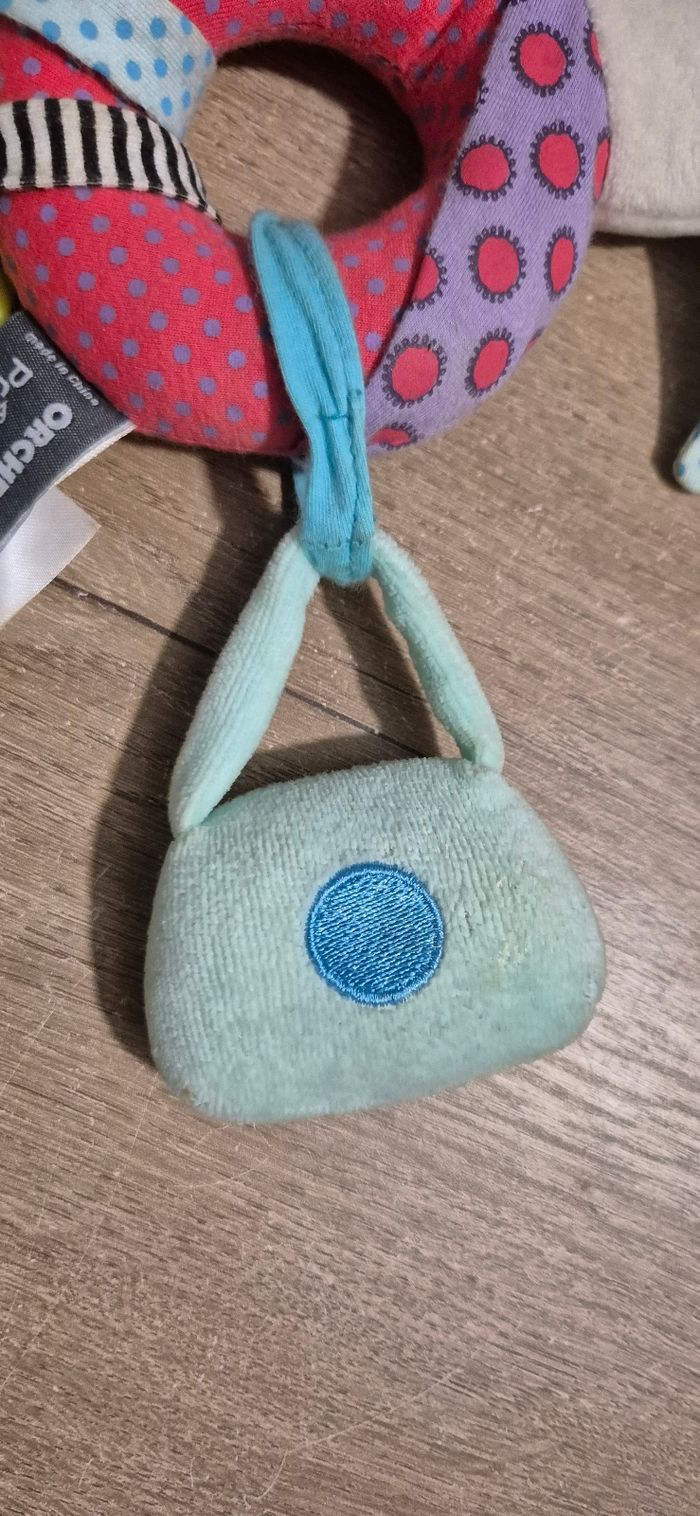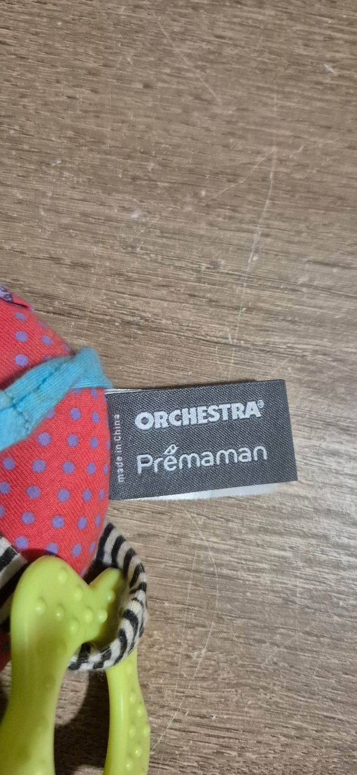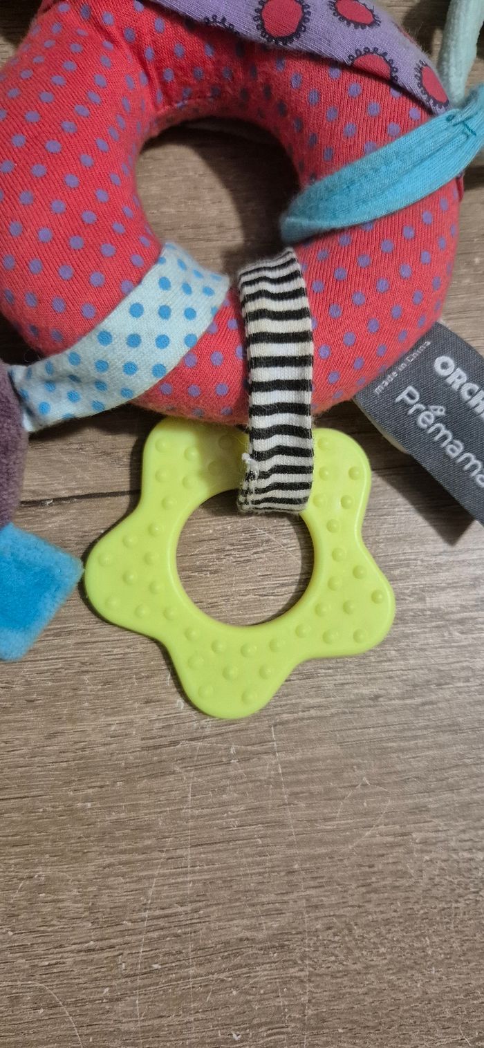 Hochet peluche d'activités Chloé la licorne Différentes textures, anneau de dentition texturé, hochet Prémaman by Orchestra Très bon état