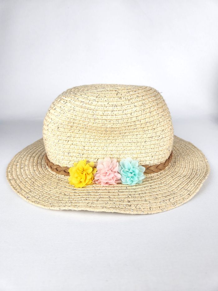 Ce chapeau de paille Petit Bateau Fille 3/4 an est idéal pour les vacances d'été, la plage ou une sortie en ville. Il est agrémenté d'une tresse décorative marron sur la base de la calotte et de petites fleurs colorées (rose, jaune, bleu) qui lui donnent une touche de fantaisie.