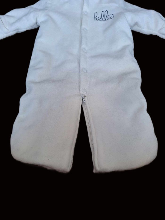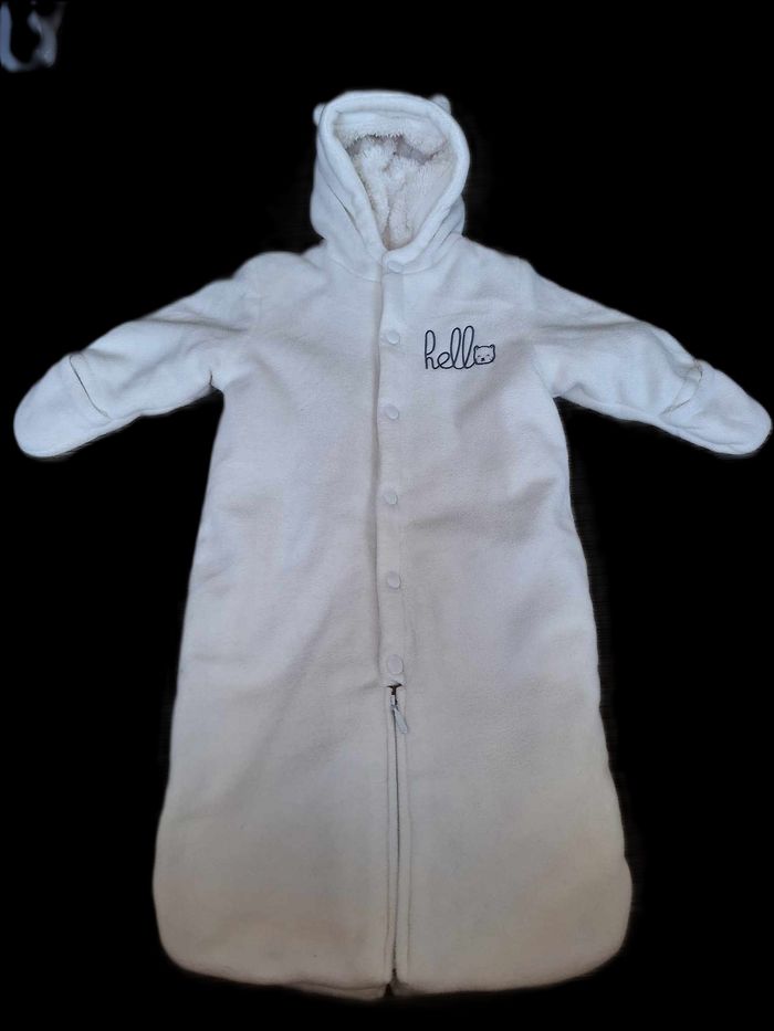 Combipilote 2 en 1 Possibilité de la mettre façon nid d'ange ou en combipilote grâce à la fermeture éclair entre les jambes Moufles intégrées et possibilité de sortir les pieds de bébé grâce aux pressions en bas Intérieur polaire Taille 9 mois N'hésitez pas à voir mon dressing, jusqu'à -25% sur les lots !