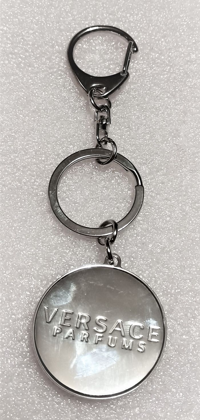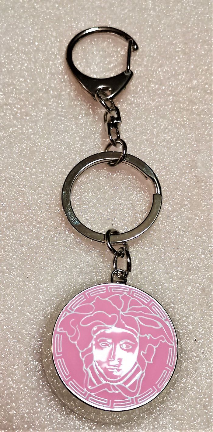 Porte clés "Versace", en métal argenté à visage logo de la marque en acrylique couleur rose, neuf, prix définitif.