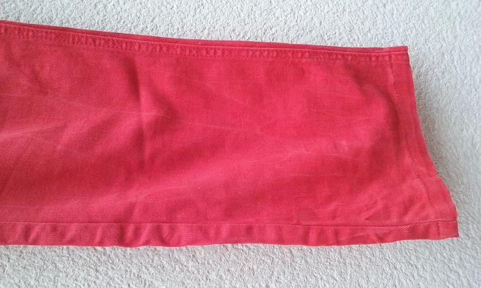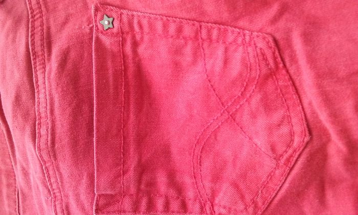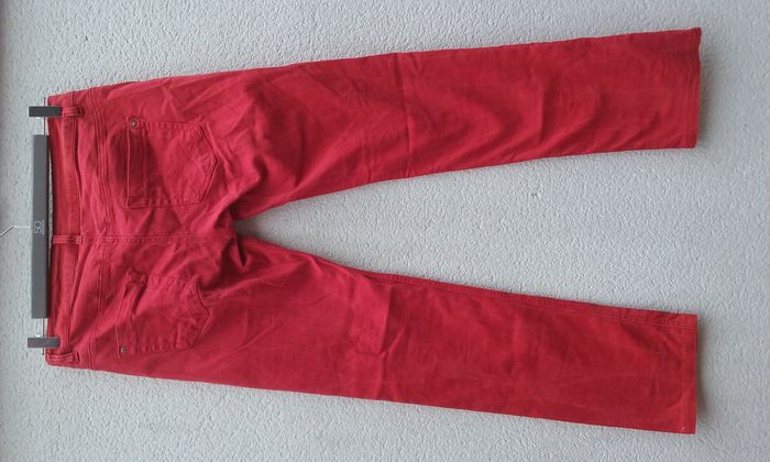 Fermeture boutonnée et zippée, coupe droite, 98% coton-2% élasthanne, attention il s'agit d'un rouge un peu plus prononcé que sur les photos!