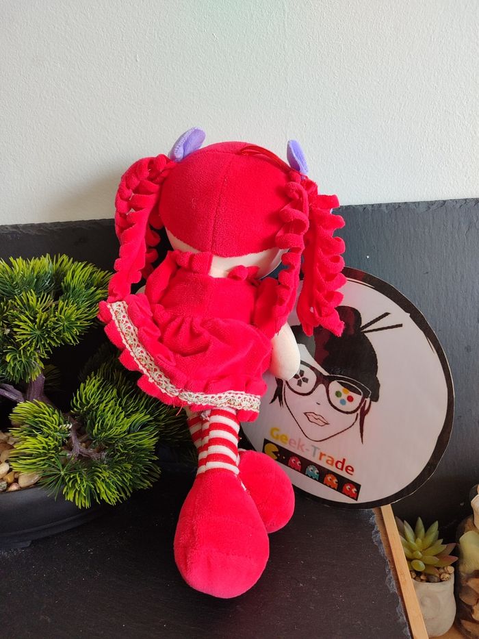 doudou peluche fille rouge robe rayé fleur papillon vert orange blanc Violet