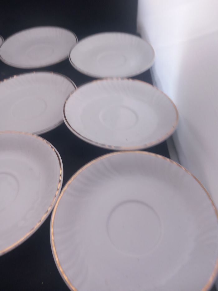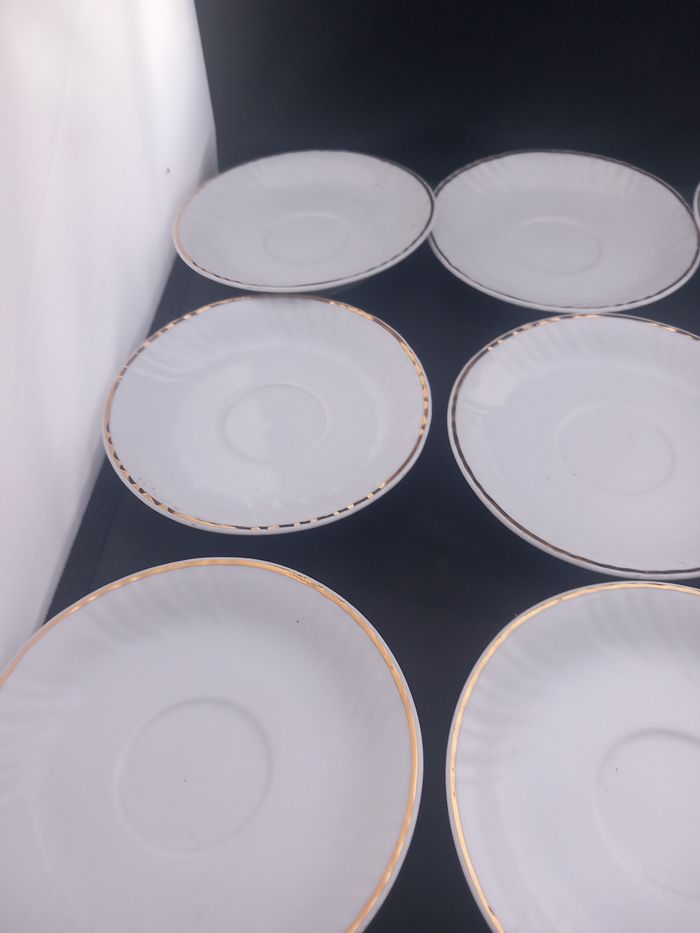 12 Sous-tasses Matière porcelaine Motifs striées et liseré Couleurs blanc et doré Estampillée véritable porcelaine En très bon état Dimensions approximative : diamètre 11,5cm de diamètre : diamètre ou poser la tasse 4cm