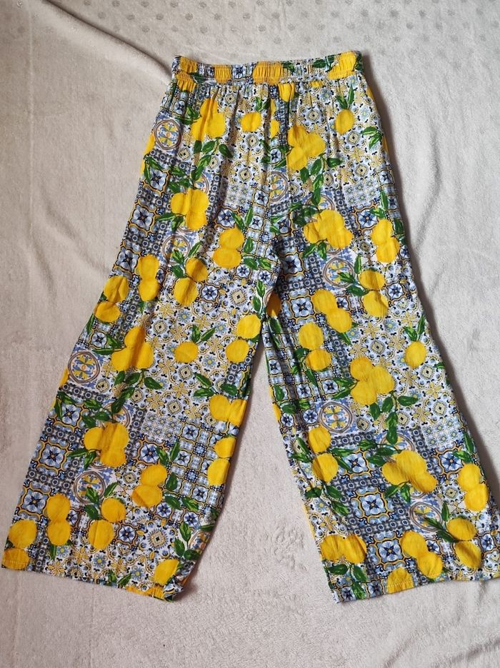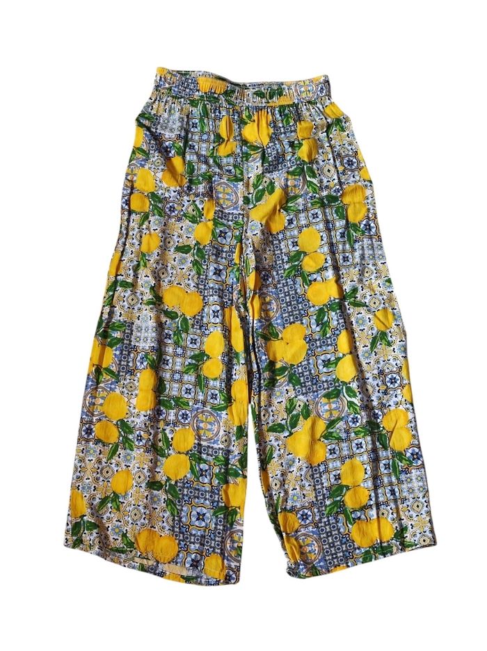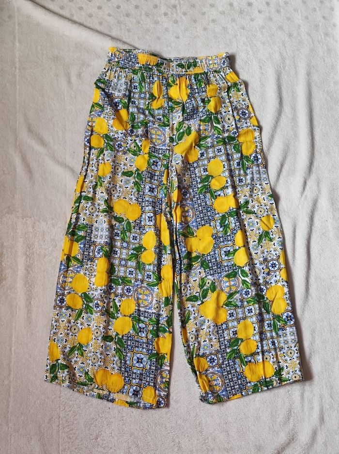 superbe pantacourt ample a jambes large, fluide et oversize. Taille élastique, de couleur diverses imprimé de citron, de quoi faire rappeller l'été. 100% viscose, très léger et agréable à porter. Marque Primark en taille XXS / 32. En parfait état, ni trous tâches ou déchirures.