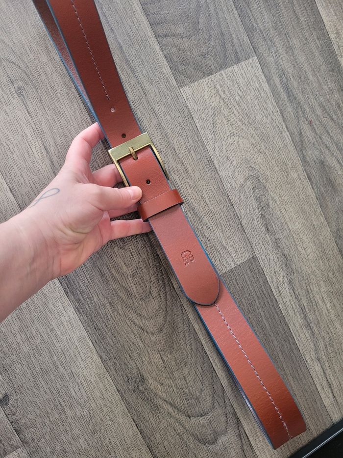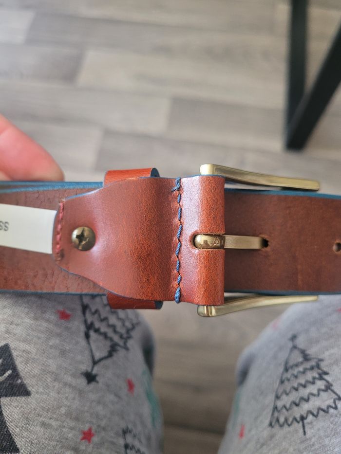 Je vends cette ceinture en cuir de coloris marron à liseré turquoise. Elle fait 115cm. Trés belle qualité! Elle n'a jamais été porté😊