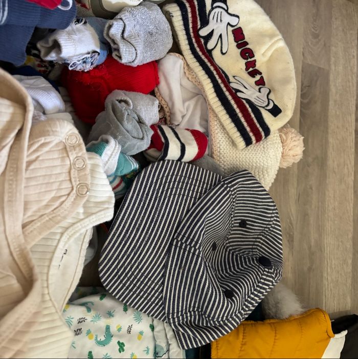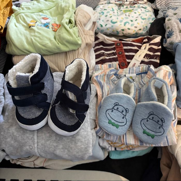 Chaussures, chaussons, bonnet, moufles, doudoune, gilet, pyjama, T-shirt manches courtes, T-shirt manches longues, pantalon, léger, pantalon fin, l'eau, très complet environ une quarantaine de pièces - Très bon état
