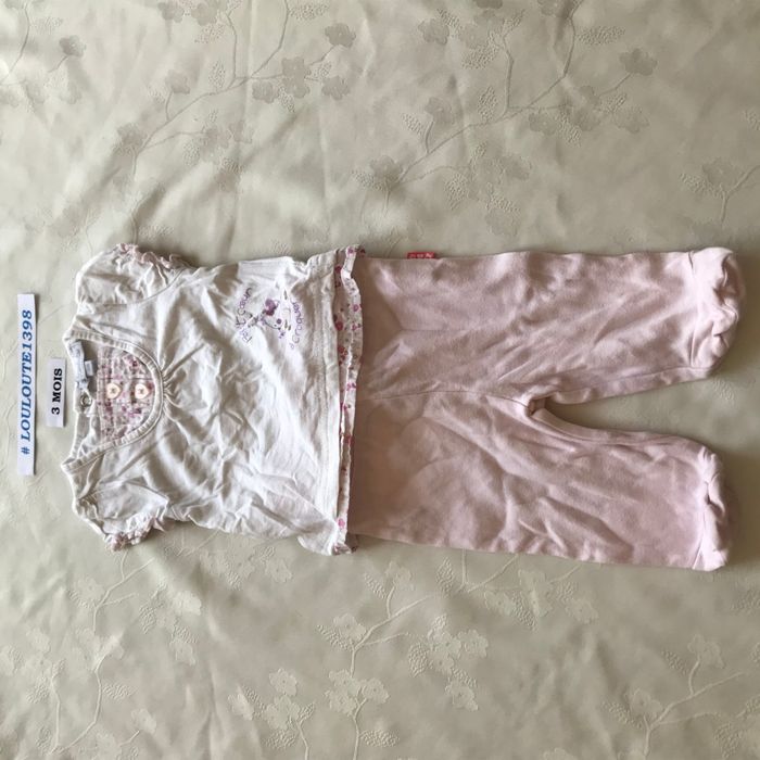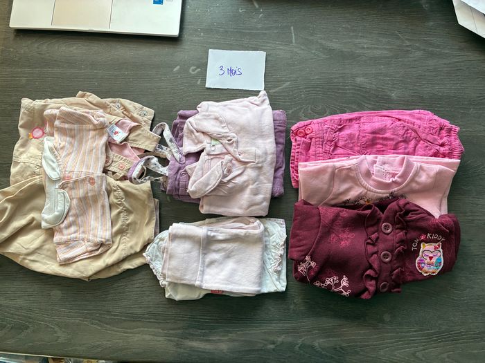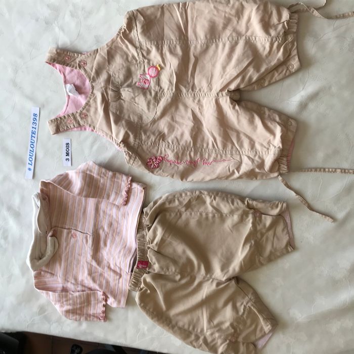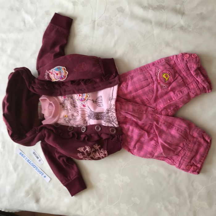 Lot d’ensembles comprenant : - Ensemble avec Salopette mauve en velours et T-shirt à manches longues rose (Baby By Vet) - Ensemble beige et rose avec salopette, T-shirt à manches longues et pantalon (C&A) - Ensemble rose/bordeaux avec Pantalon, Sweat et Veste boutonnée à Capuche (Tom et Kiddy) - Ensemble avec T-Shirt à manches courtes blanc + pantalon rose (Kimbaloo), en bon état Le lot peut être séparé 😉