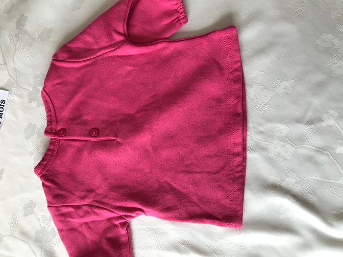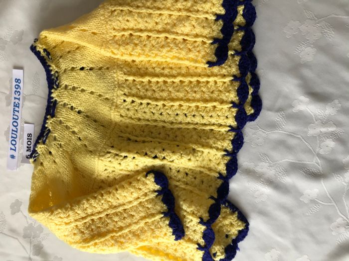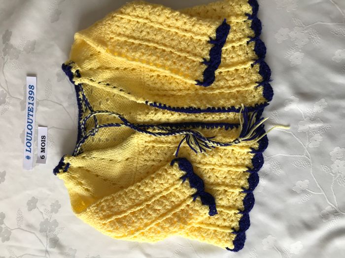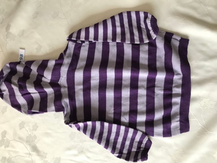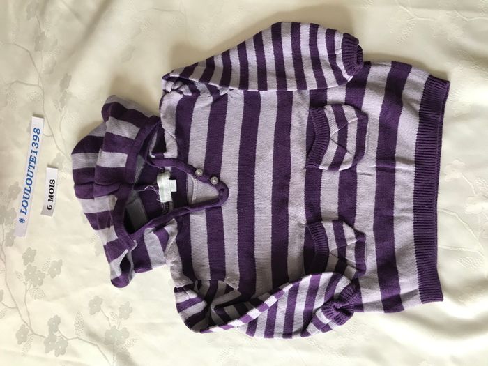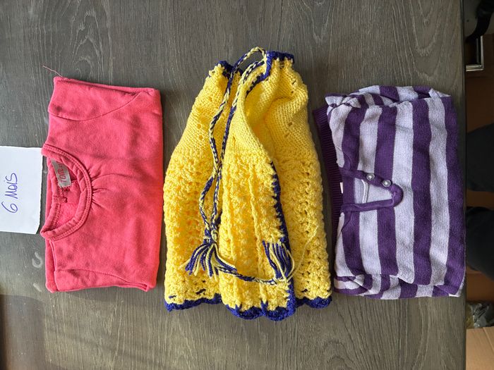 Lot de Pulls & Gilets comprenant : - Gilet en laine jaune et marine, tricoté à la main - Sweat rose (Tom & Kiddy) - Pull à Capuche violet (Kimbaloo) Le lot peut être séparé 😉