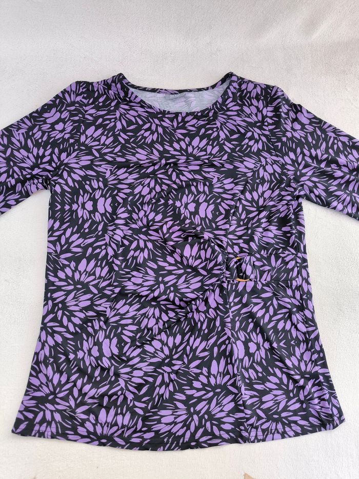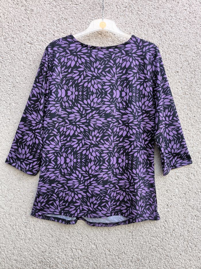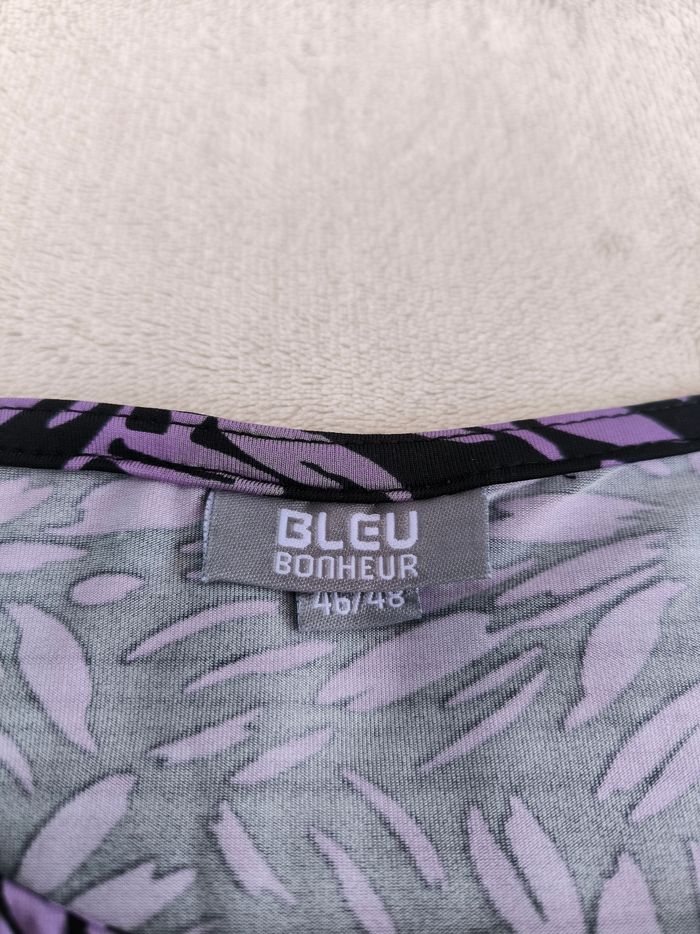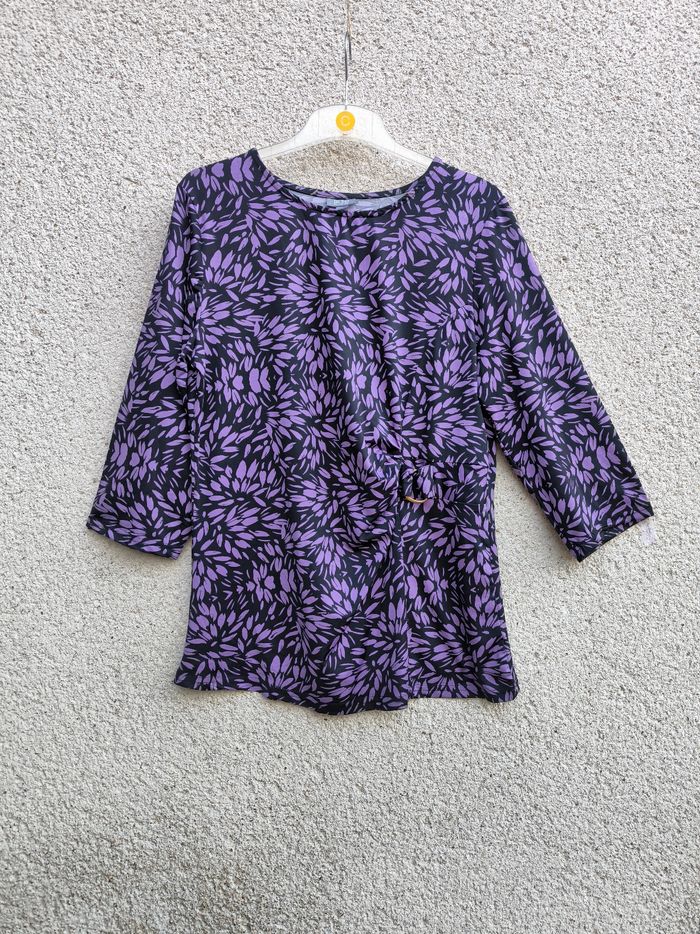 Blouse / T-shirt à manches 3/4 Marque Bleu Bonheur Taille 46-48 • Coloris noir, violet lilas • Imprimés/Motifs • Col rond • Fronces à la taille avec boucle • Tissu fin, stretch Largeur épaule à épaule non étirée : 40 cm Largeur épaule à épaule étirée au maximum : 70 cm Largeur aisselle à aisselle non étirée : 52 cm Largeur aisselle à aisselle étirée au maximum : 90 cm Longueur manche : 45 cm Longueur totale : 67 cm Longueur aisselle : 45 cm Comme neuve #evelyne_taille_46 #evelyne_taille_48