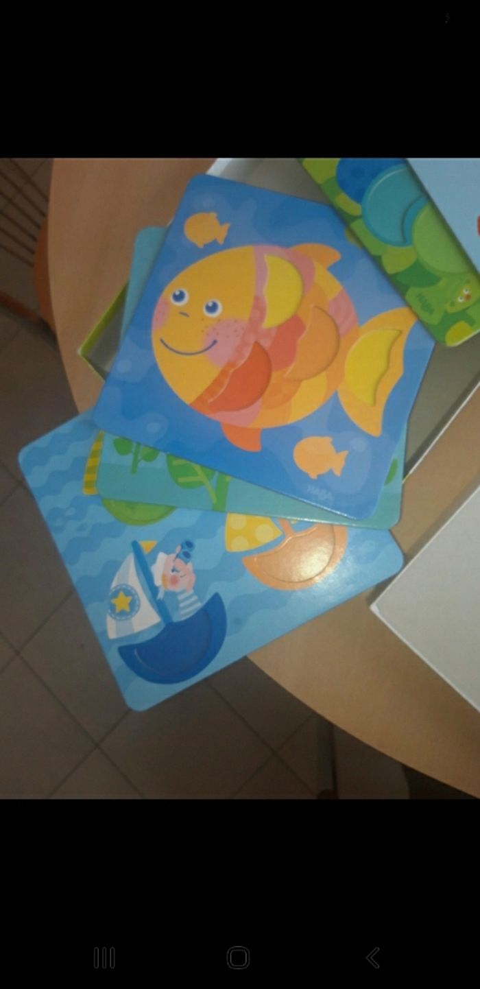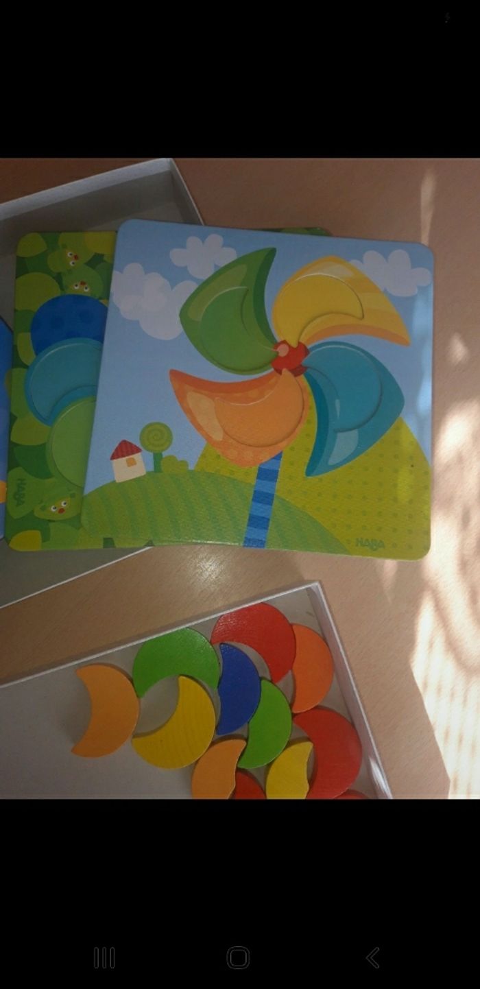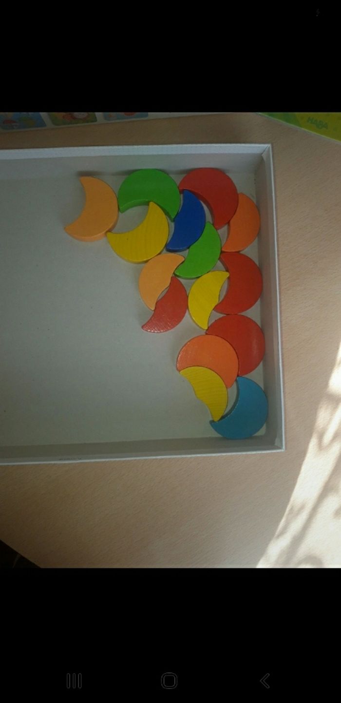 Ranger en respectant la couleur ou en laissant libre cours à son imagination. Plaques en carton et lunes en bois. Complet et en très bon état. Seule la boîte a été recollée et une plaque est tachée au dos. Parfait en pédagogie Montessori et école maternelle pour reconnaître et classer par couleur