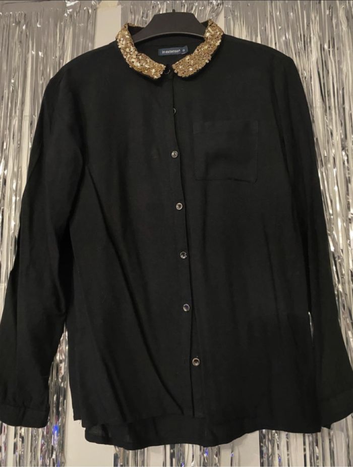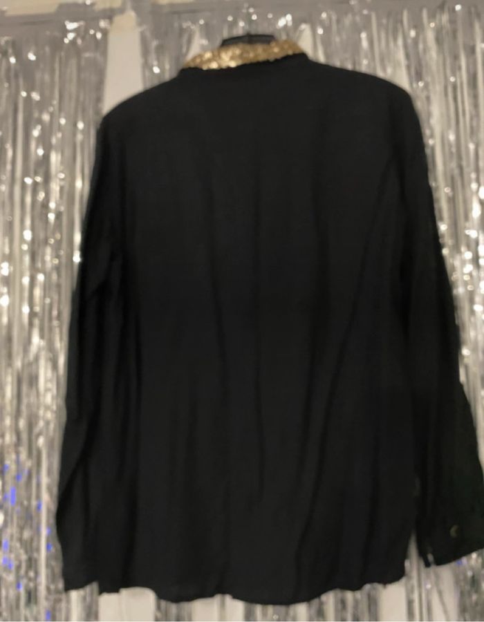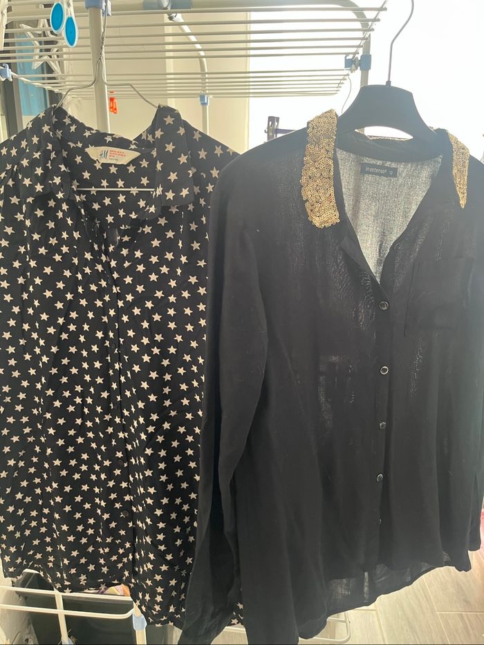 Lot de 2 chemises 10/12 ans : 9€ Joli chemisier noir avec le col en sequins dorés. Bon état ( juste les boutons un peu râpeux sur les contours voir photo) . 12 ans . Chemisier H&m noir avec des étoiles blanches . 10/11 ans Taille un peu plus grand . Mis qu’une seule fois .
