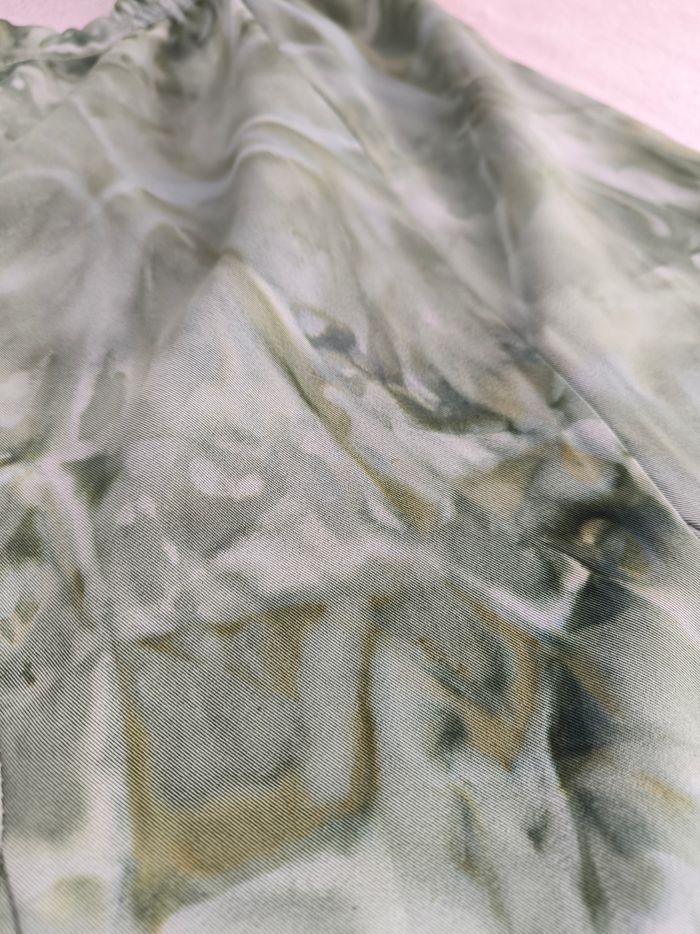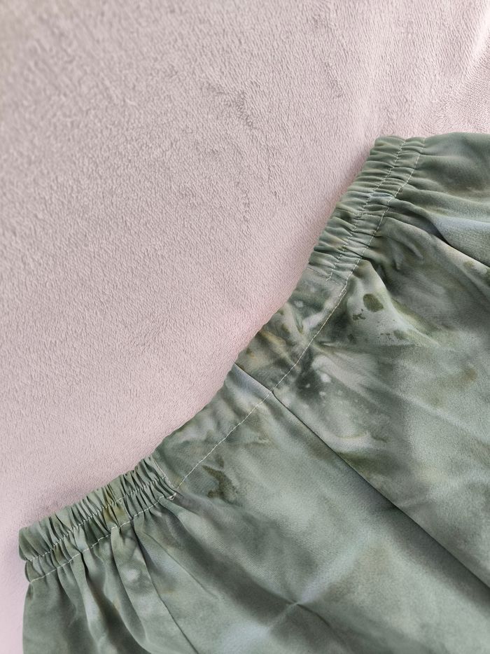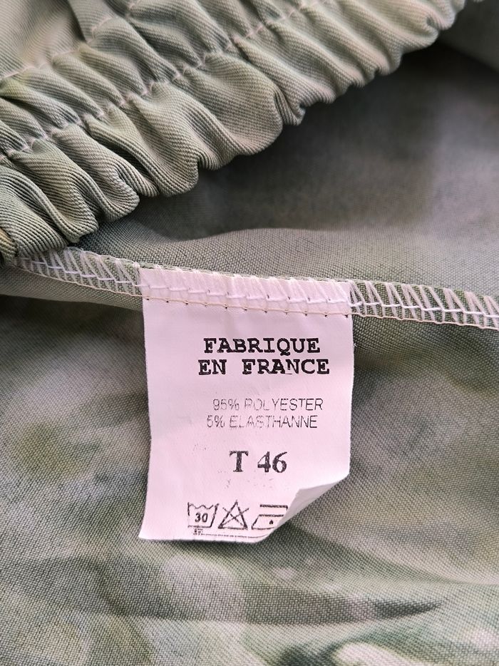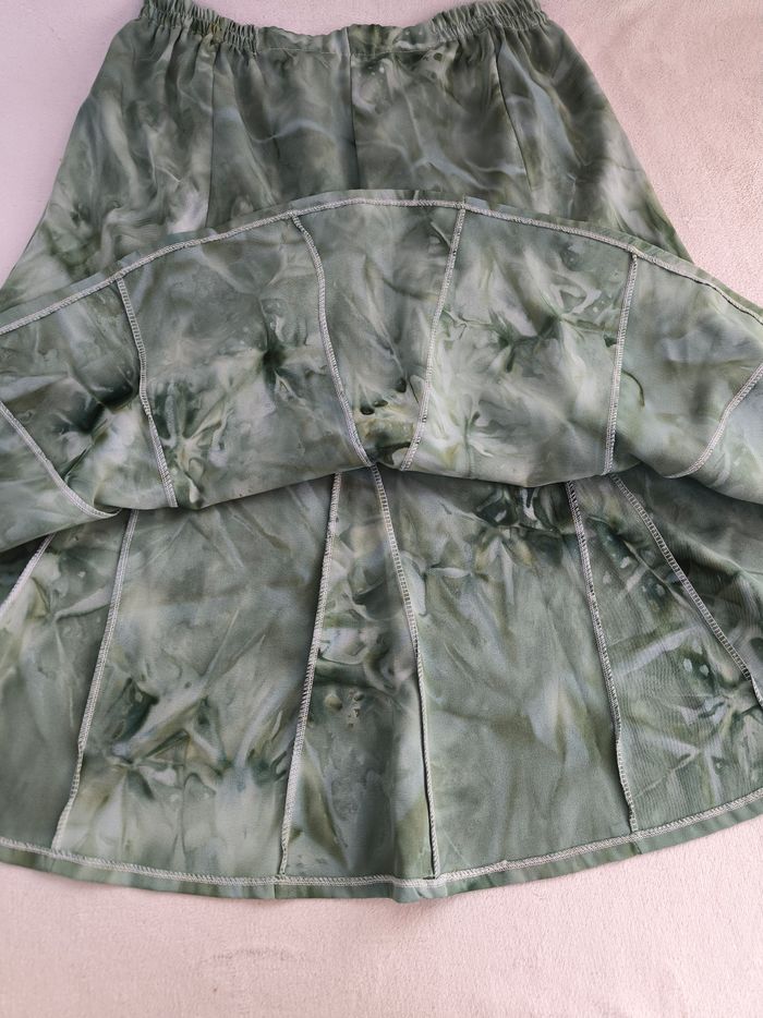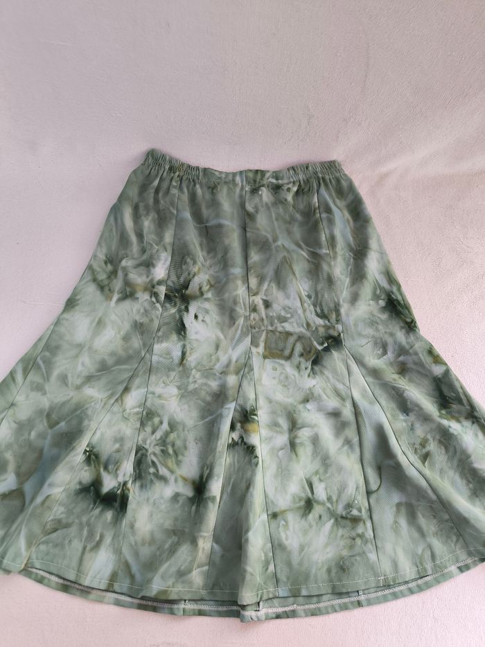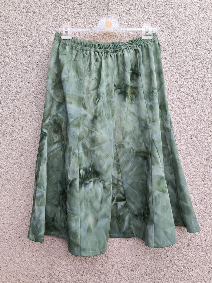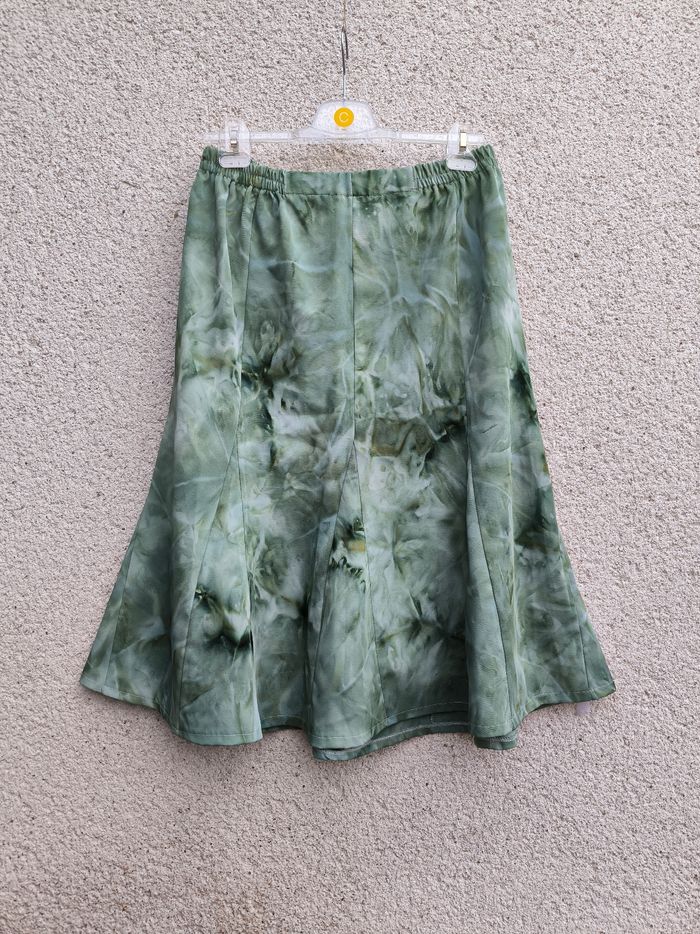 Jupe Taille 46 • Coloris vert, bleu • Imprimés style tie & dye • Taille élastique • Tissu fin • Fabriquée en France Largeur taille non étirée : 35 cm Largeur taille étirée au maximum : 61 cm Longueur totale : 71 cm Peu portée, en très bon état #evelyne_taille_46