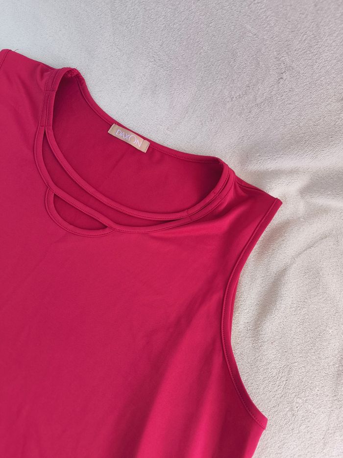 Débardeur à larges bretelles Marque Daxon Taille 48 • Coloris rose • Col rond avec lanières • Effet satiné • Tissu fin Largeur aisselle à aisselle non étirée : 54 cm Largeur aisselle à aisselle étirée au maximum : 84 cm Longueur totale : 68 cm Longueur aisselle : 48 cm Peu porté, en très bon état proche du neuf #evelyne_taille_48