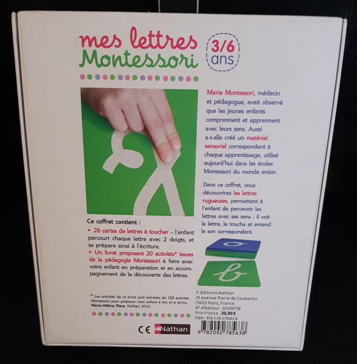 Dans ce coffret vous découvrirez les lettres rugueuses, permettant à l'enfant de percevoir les lettres avec ses sens : il voit la lettre, la touche et entend le son correspondant. L'enfant les mémorise mieux car plusieurs sens sont sollicités. Le coffret contient le matériel Montessori suivant : - 26 cartes de lettres à toucher : l'enfant parcourt chaque lettre avec 2 doigts, et se prépare ainsi à l'écriture. - Un livret proposant 20 activités issues de la pédagogie Montessori à faire avec votre enfant en préparation et en accompagnement de la découverte des lettres. Prix Neuf indicatif : 20,90 E. Coffret cartonné Format 180x207x48 EAN 9782092785638 oct-13 Très Bon État, coffret ouvert sans manque sur un côté sur 1,5 cm, intérieur TBE, livret avec une bonne pliure sur couverture, sans écritures. Une imposante liste de livres pour enfants disponibles, essayez un premier contact :) Poids : 1130 g