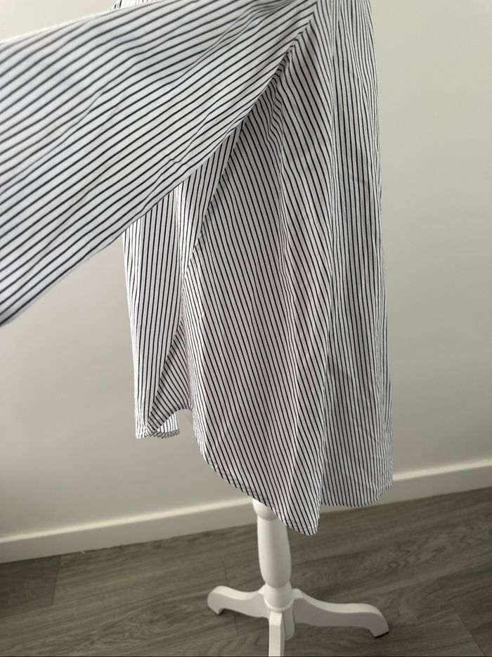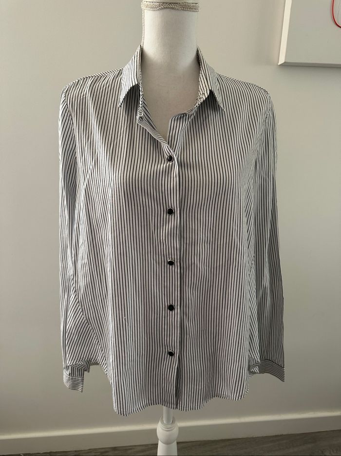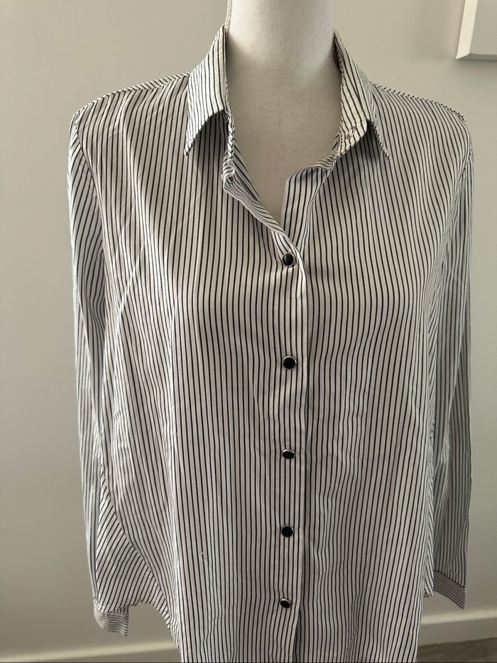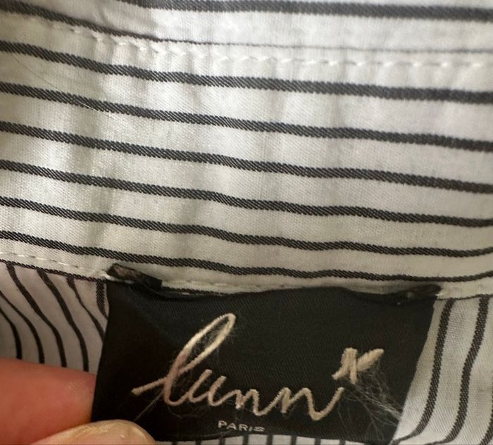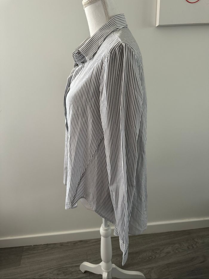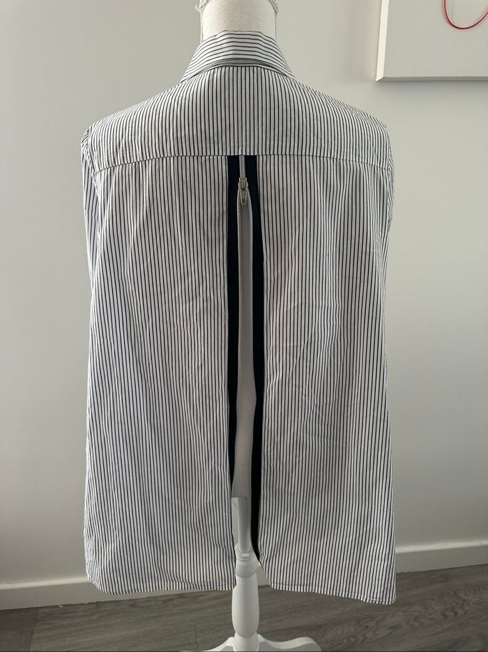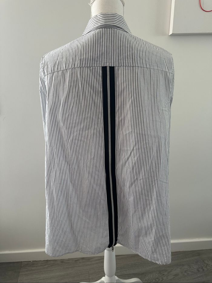 Chemise - Excellent état - Taille 42 équivalent XL Dimensions en bas de l’annonce - Marque Lunn Paris - Noire et blanche - À rayures - Coupe asymétrique - Se ferme avec des boutons à l’avant - Long zip à l’arrière - Pas d’étiquette de taille ni de matière Dimensions: - 43cm niveau épaules - 55cm niveau aisselles - 56cm de long à l’avant - 72cm de long à l’arrière