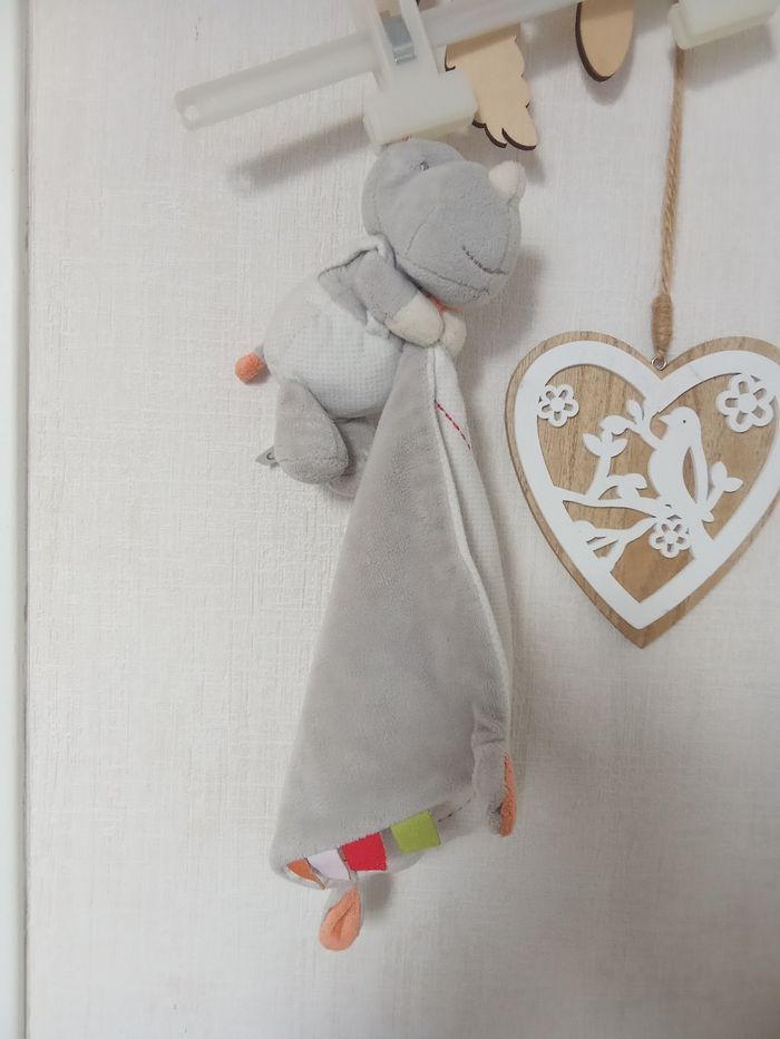 Doudou hippopotame, rhinocéros gris, blanc, orange, vert , broderie  Riri, mouchoir, étiquettes - photo numéro 5