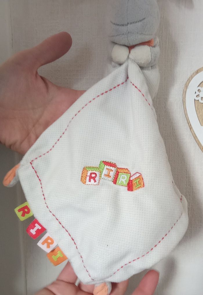 Très joli doudou mouchoir brodé Riri motif rhinocéros gris. À noter une légère Trace. Étiquette présente. Bon état général De nombreux autres doudous Également à vendre ds mon dressing et réduction activée