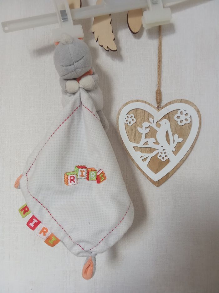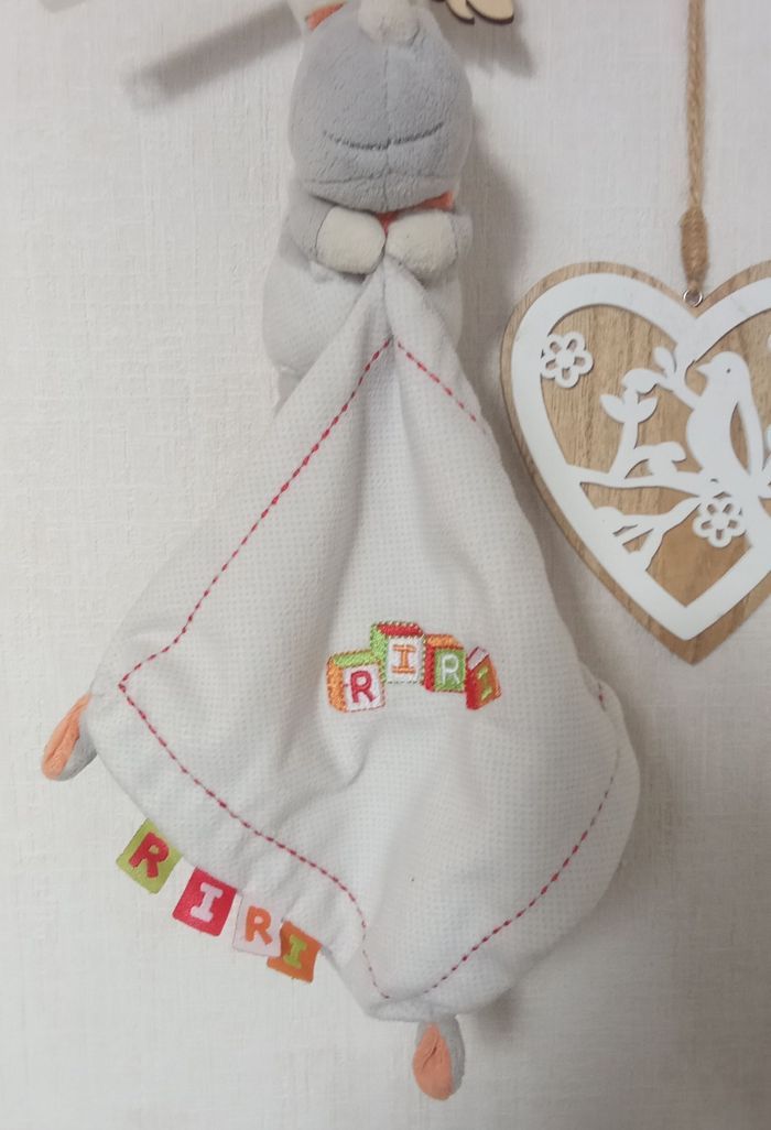 Doudou hippopotame, rhinocéros gris, blanc, orange, vert , broderie  Riri, mouchoir, étiquettes