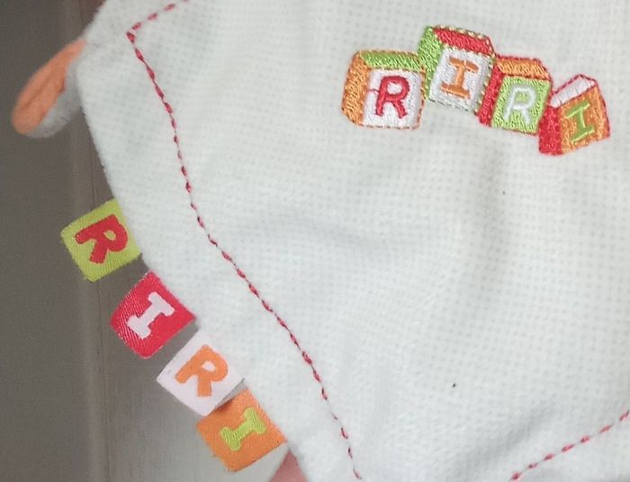 Doudou hippopotame, rhinocéros gris, blanc, orange, vert , broderie  Riri, mouchoir, étiquettes - photo numéro 6